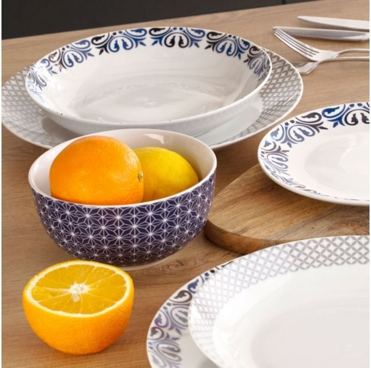 Gama Marocco este o o gama de vesela, bogat decorata cu ornamente marocane. Introduce o atmosfera orientala in sala de mese si insufleteste masa. in colectia Marocco, culorile fac ca decoratiunile bogate sa se armonizeze cu orice interior, introducand in acelasi timp o atmosfera exotica. Colectia este dominata de nuante de gri si bleumarin. Farfuriile si bolurile sunt din portelan alb de inalta calitate. Toate vasele pot fi spalate in masina de spalat vase.