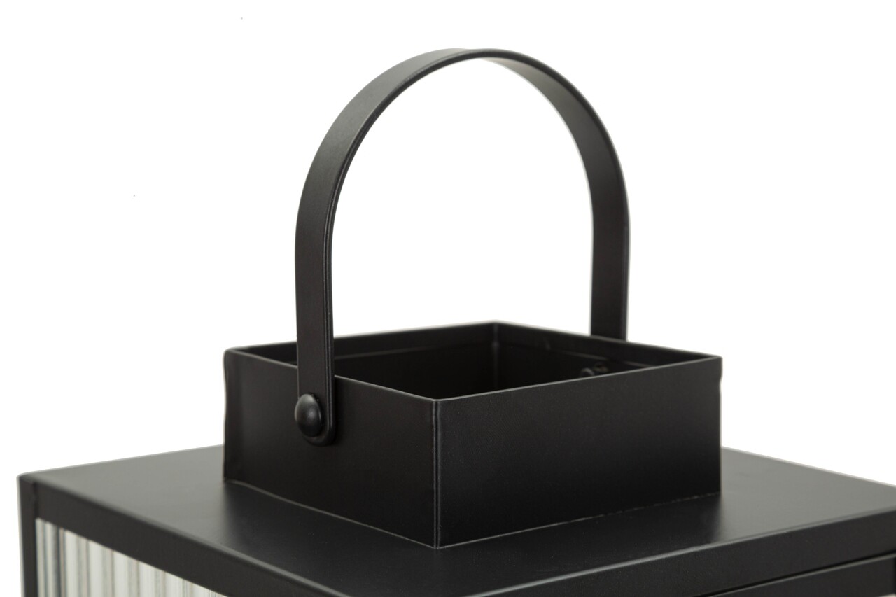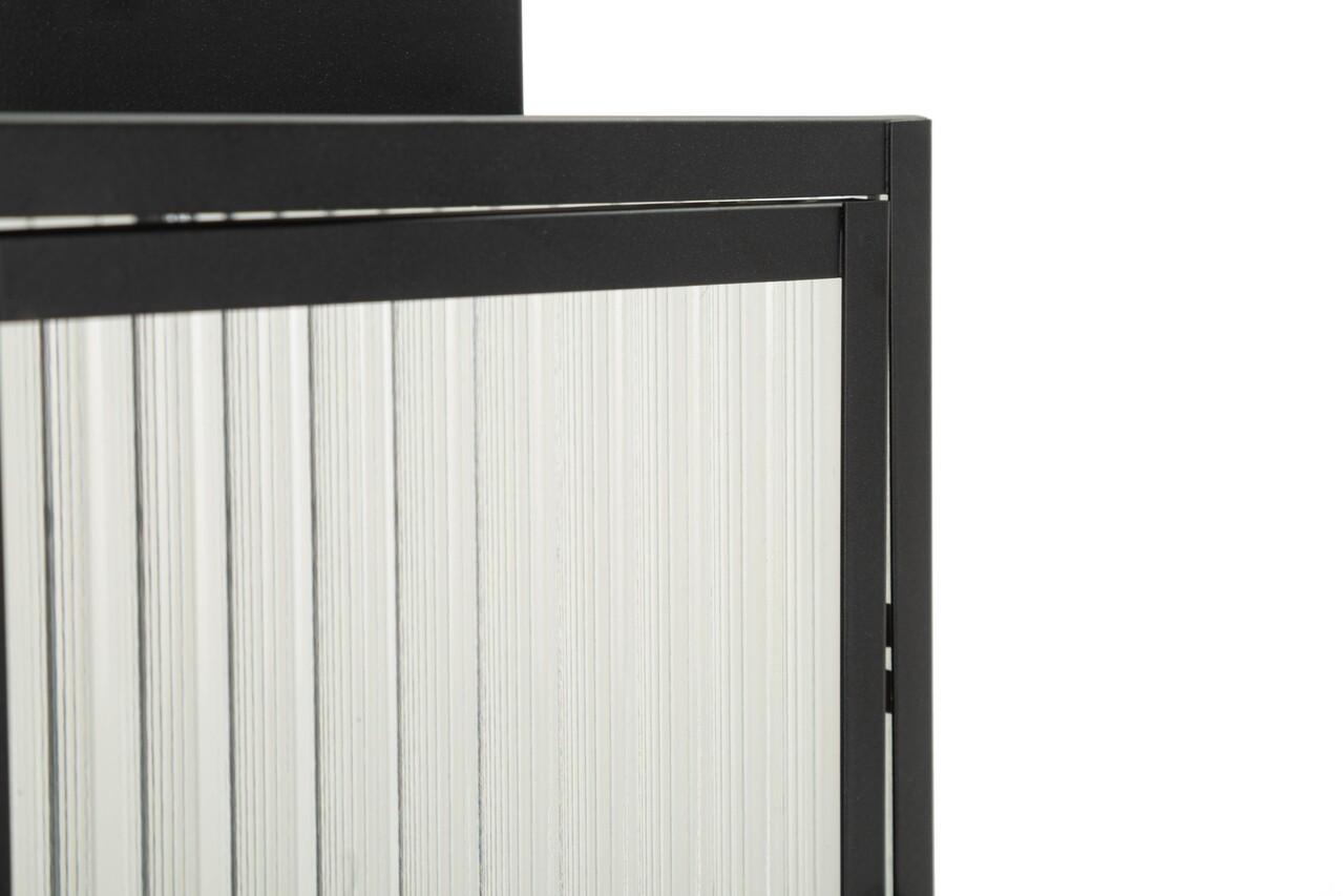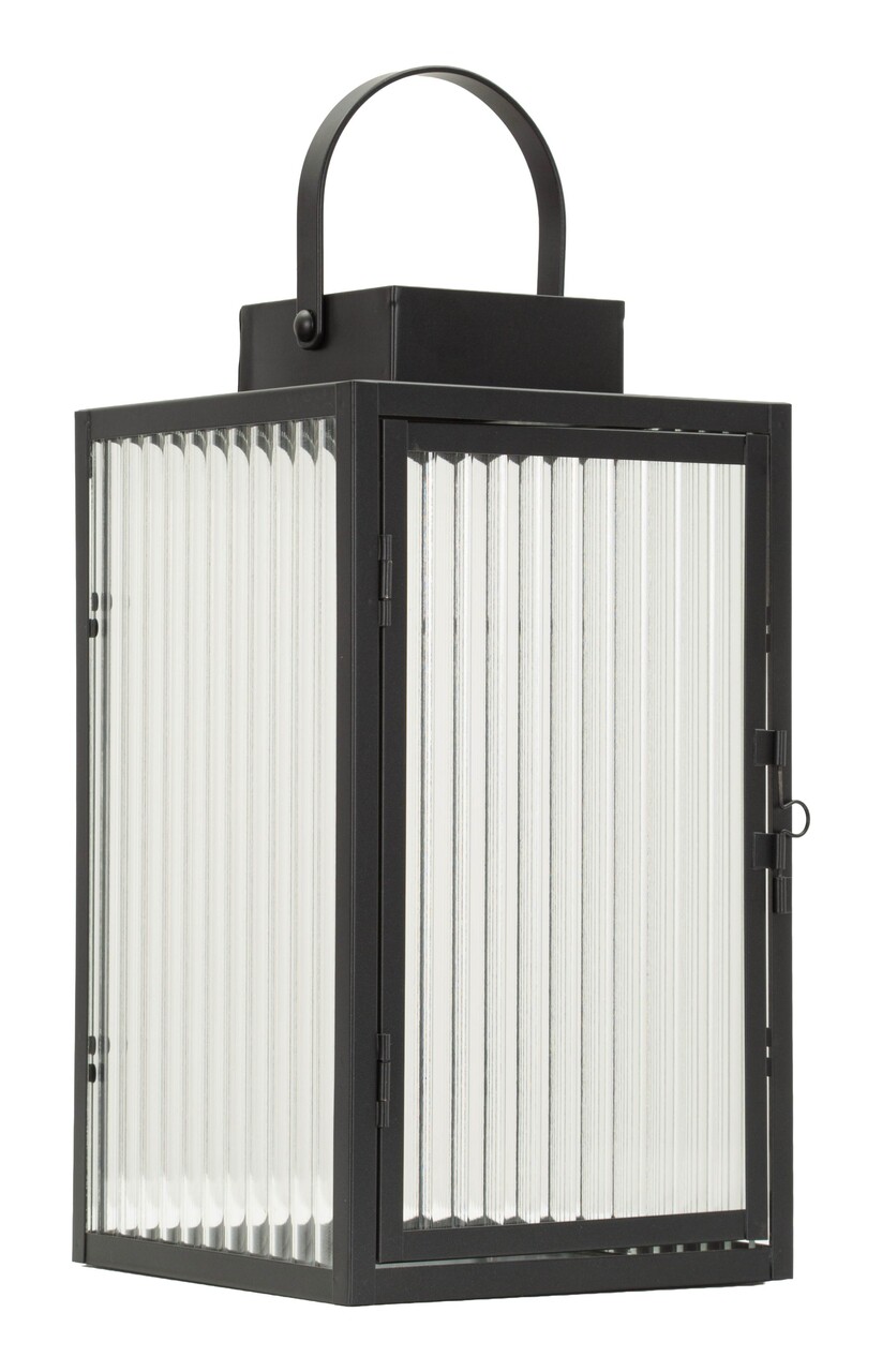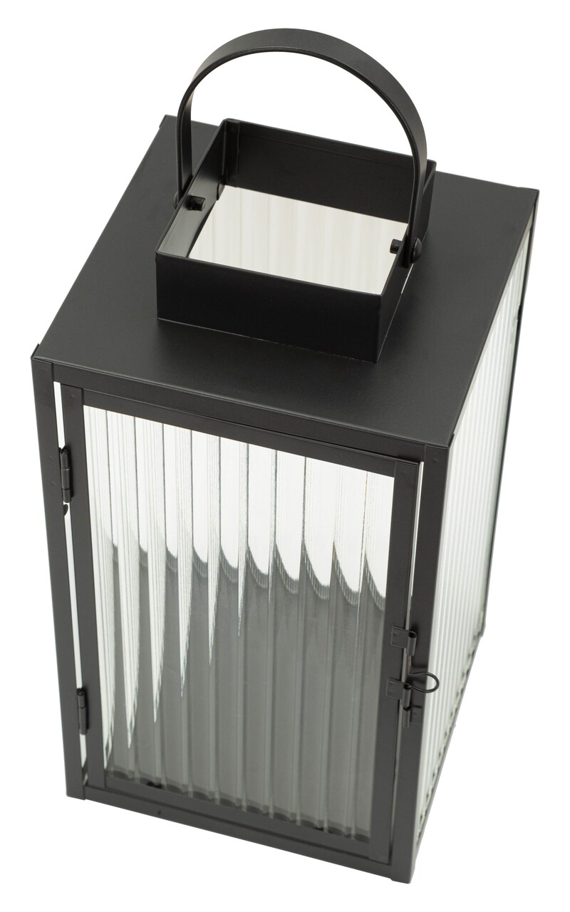 Felinar din metal negru cu sticla securizata texturata. Lumina difuza creeaza o atmosfera calda si primitoare.
