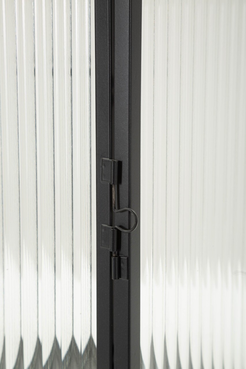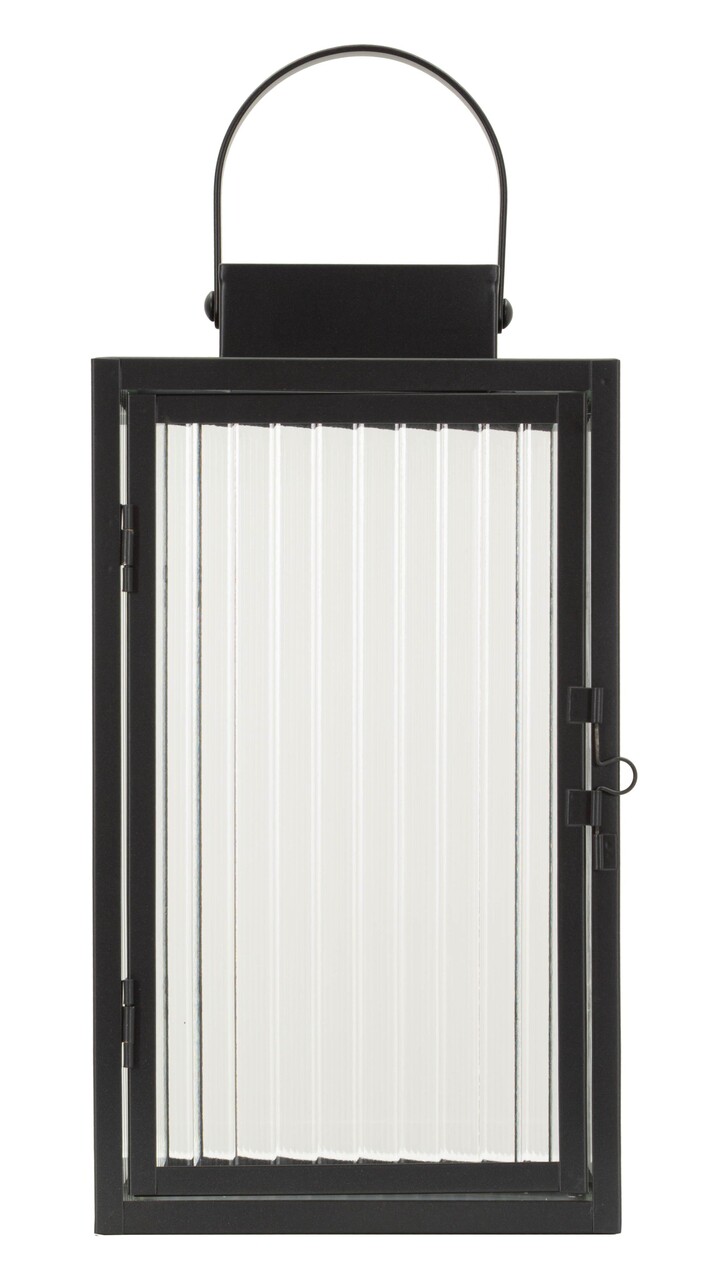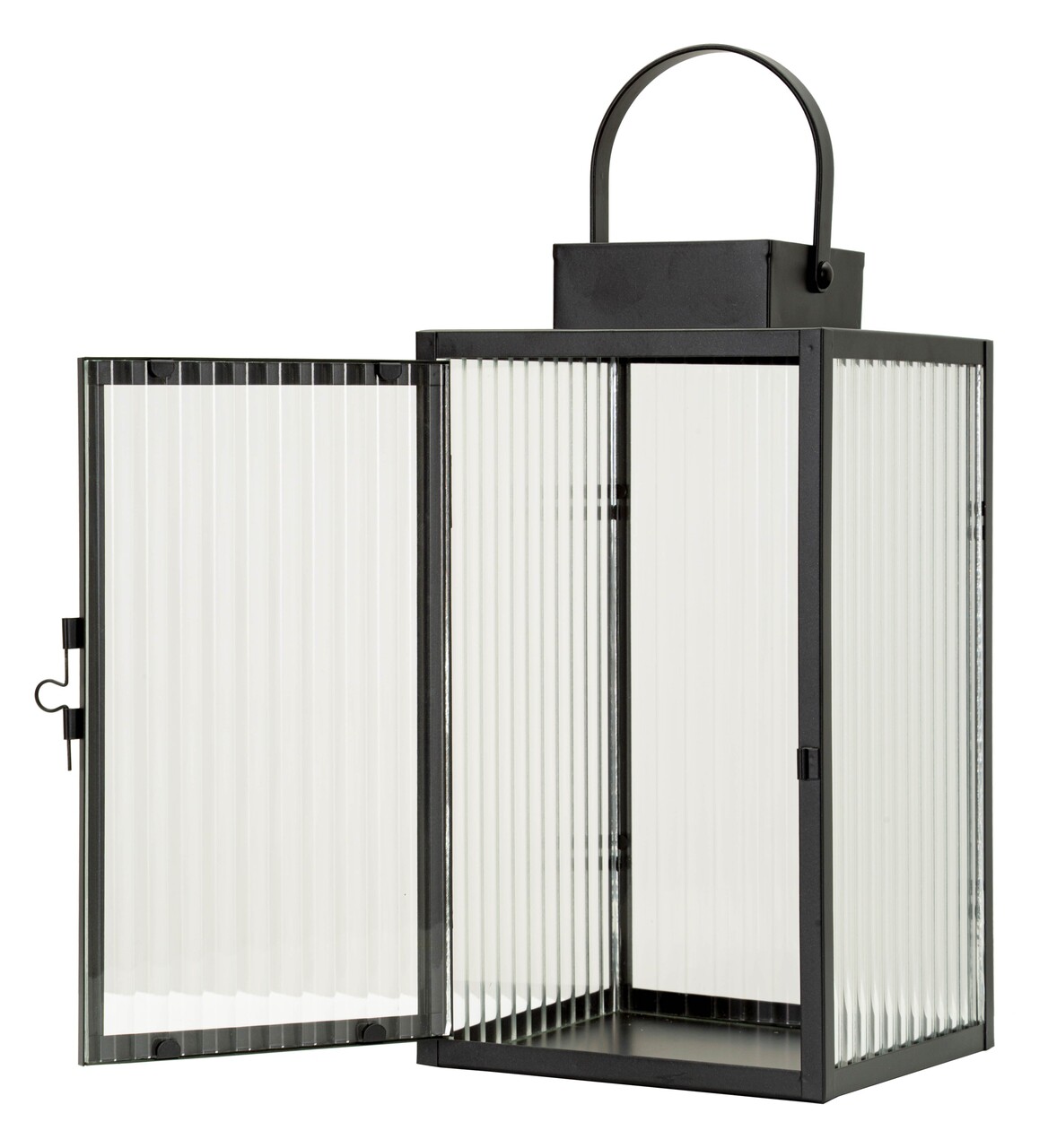 Felinar din metal negru cu sticla securizata texturata. Lumina difuza creeaza o atmosfera calda si primitoare.