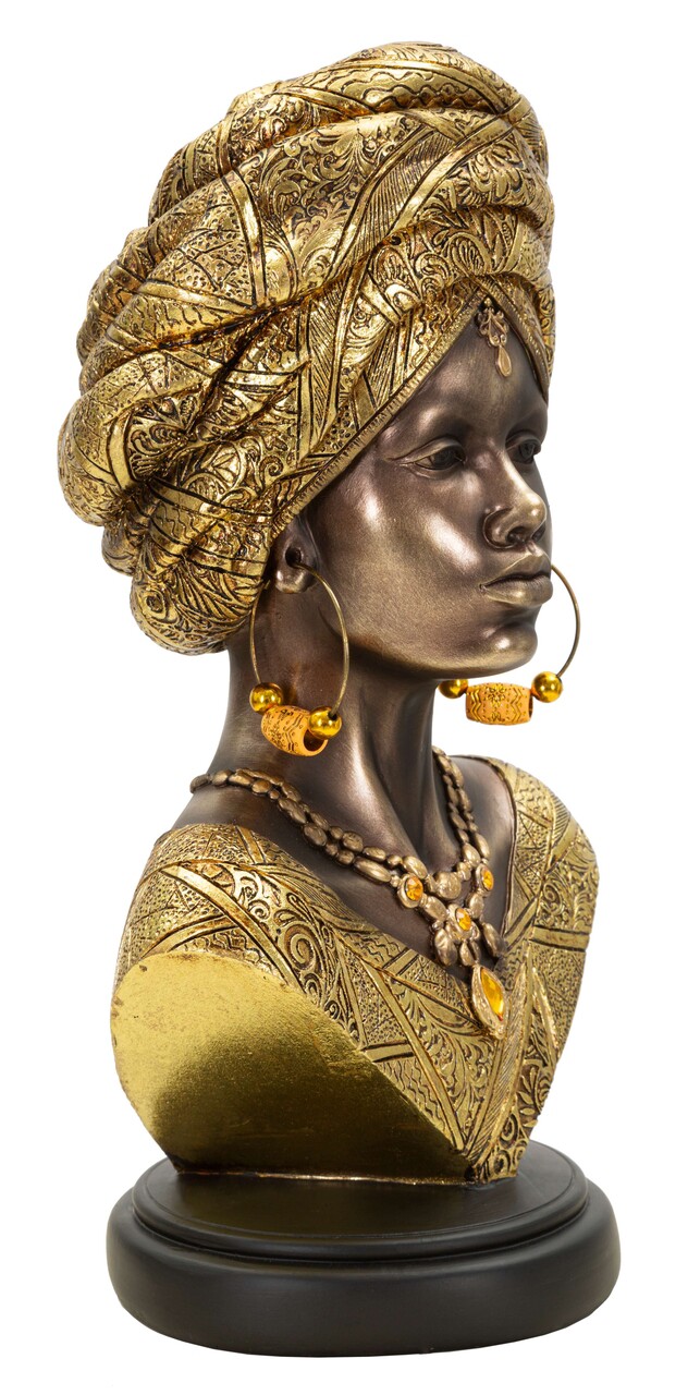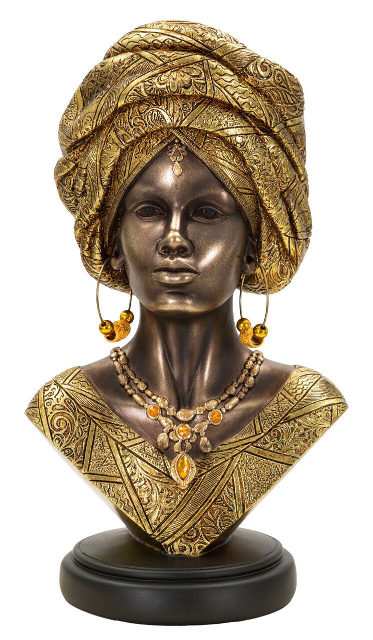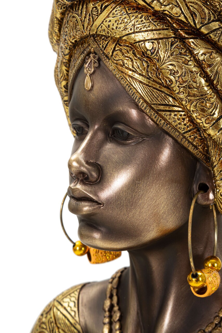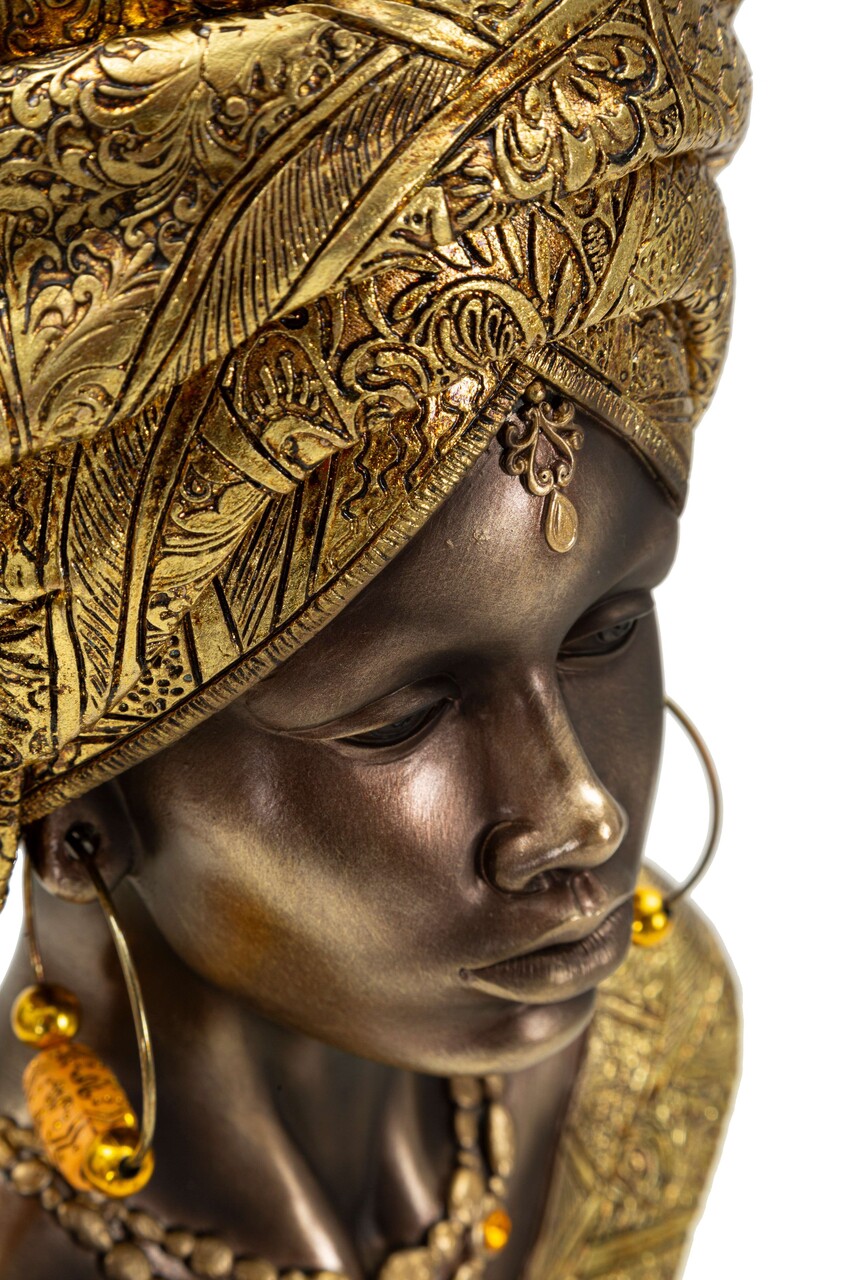 Bust decorativ al unei femei cu turban si haine inspirate din cultura africana. Un obiect cu expresivitate puternica, potrivit pentru decoruri exotice sau etnice.