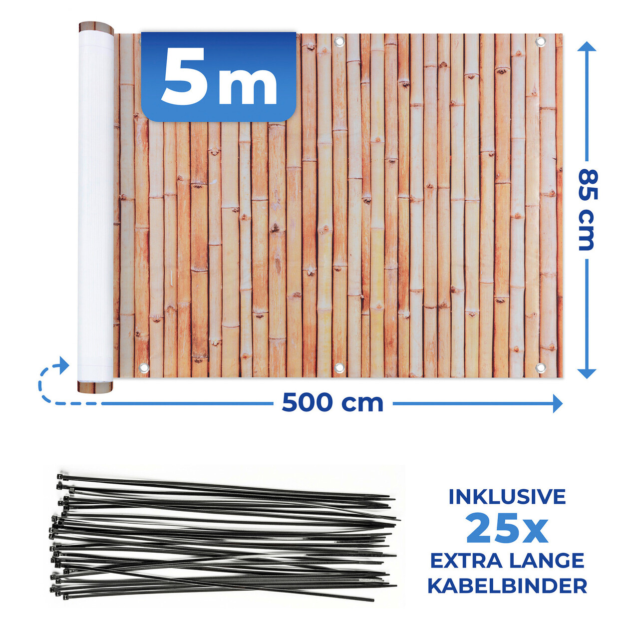 Cu o lungime de 5 metri si o inaltime de 85 cm, inclusiv 25 de cleme extra lungi, rezistente la UV, pentru o fixare optima, folia paravan pentru balcon ofera flexibilitate si durabilitate. De asemenea, poate fi taiata cu usurinta la lungime si inaltime pentru a se potrivi perfect balconului dumneavoastra.