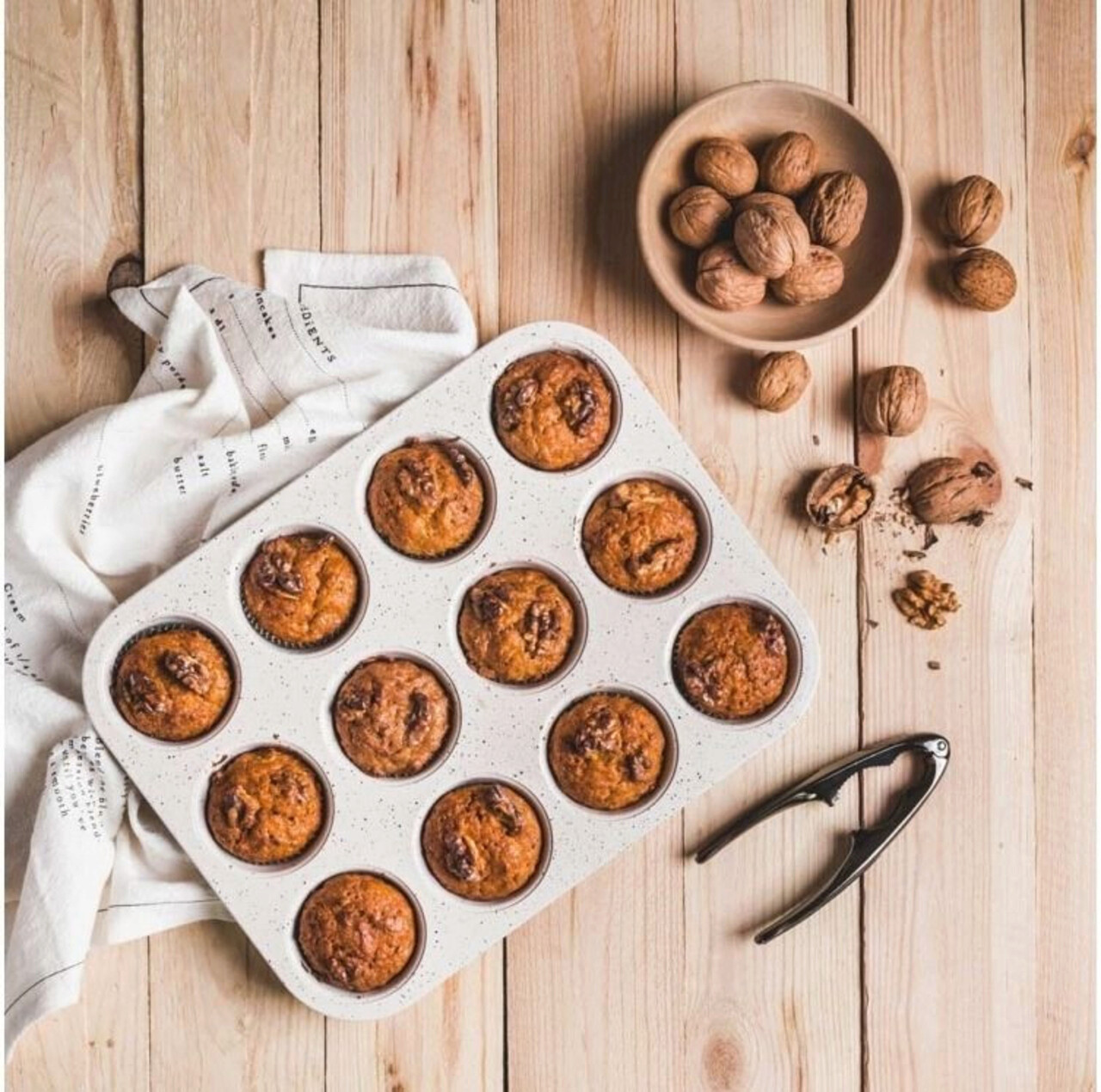 Forma muffin pentru copt cu un aspect inspirat din piatra naturala, acest design fiind unul din cele mai moderne in momentul de fata pentru vasele de bucatarie. Forma are un invelis rezistent la lipire, astfel puteti coace desertul preferat mult mai rapid si mai sigur.
