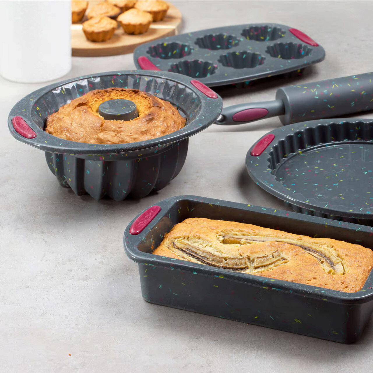 Formele pentru copt din colectia Ambition Felice sunt ideale pentru cei care doresc sa pregateasca diverse tipuri de produse de patiserie, de la paine la prajituri. Fabricate din silicon de inalta calitate, care le face rezistente la temperaturi ridicate, asigura o coacere uniforma si nu absorb arome si mirosuri. Datorita elasticitatii materialului, produsele coapte vor iesi usor din tava, iar curatarea va fi foarte simpla si rapida. Intarirea suplimentara ne permite sa punem forma in cuptor fara teama de a varsa. Produsele au un design modern, sunt usoare si flexibile, ceea ce le face usor de depozitat si transportat. Culorile sunt elegante, in timp ce decorul tip confetti colorat le face vesele si pline de vigoare. Sunt rezistente la temperaturi scazute si ridicate intre -40°C si +230°C.