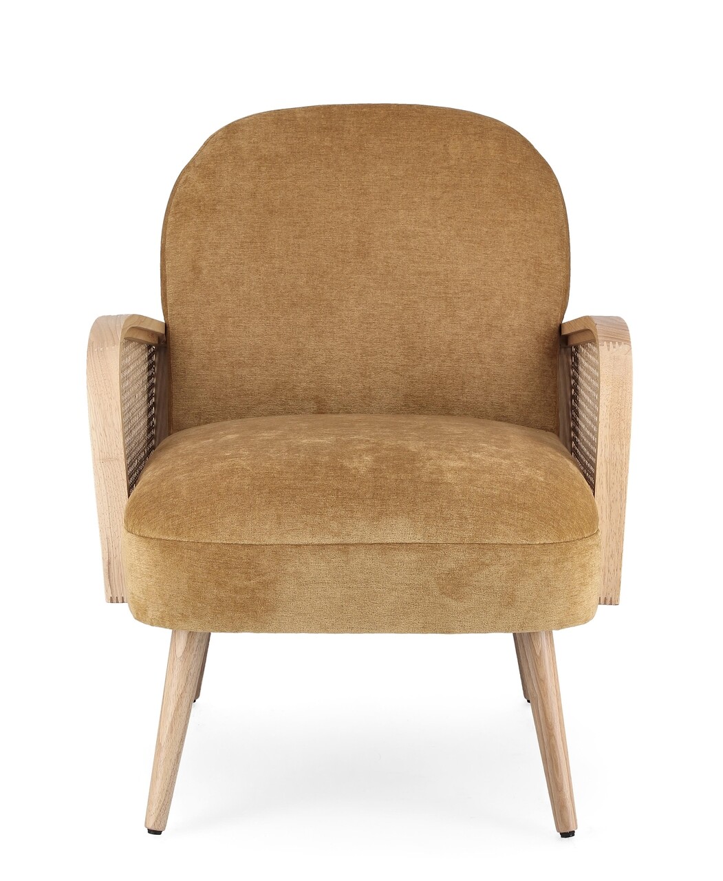 Fotoliu Dalida, Bizzotto, 65 x 74 x 81 cm, lemn de pin/ratan/catifea, galben mustar