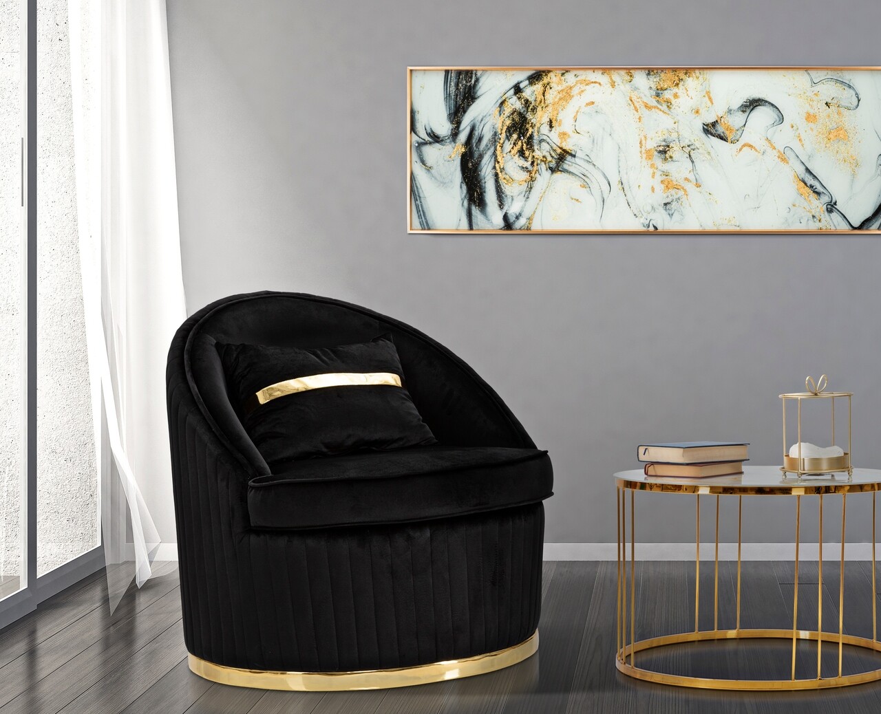 Fotoliu rotund elegant din material capitonat, cu spatar, cu linii simple si moderne, impodobit cu un decor elegant auriu la baza. Completat cu o perna cu decor geometric auriu.