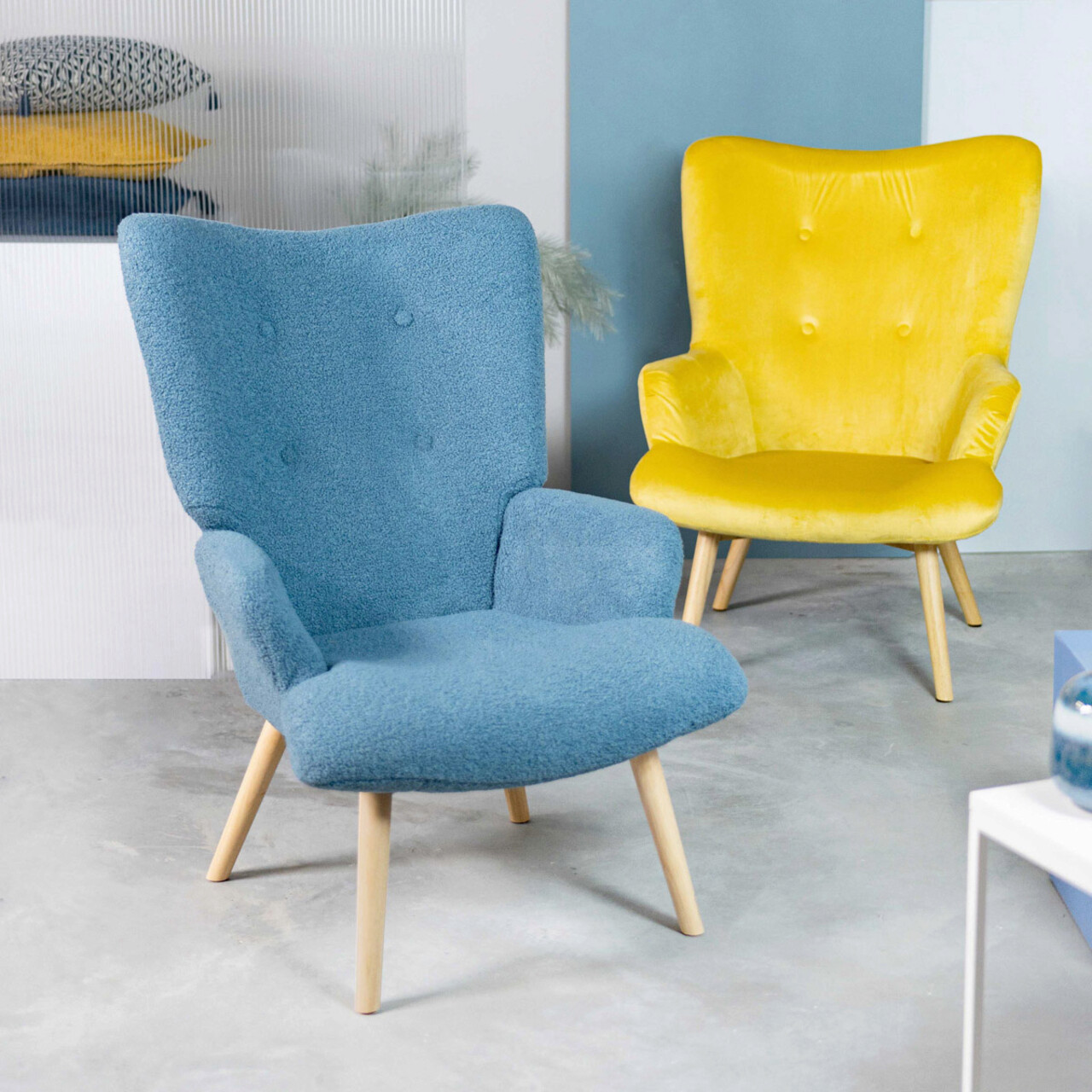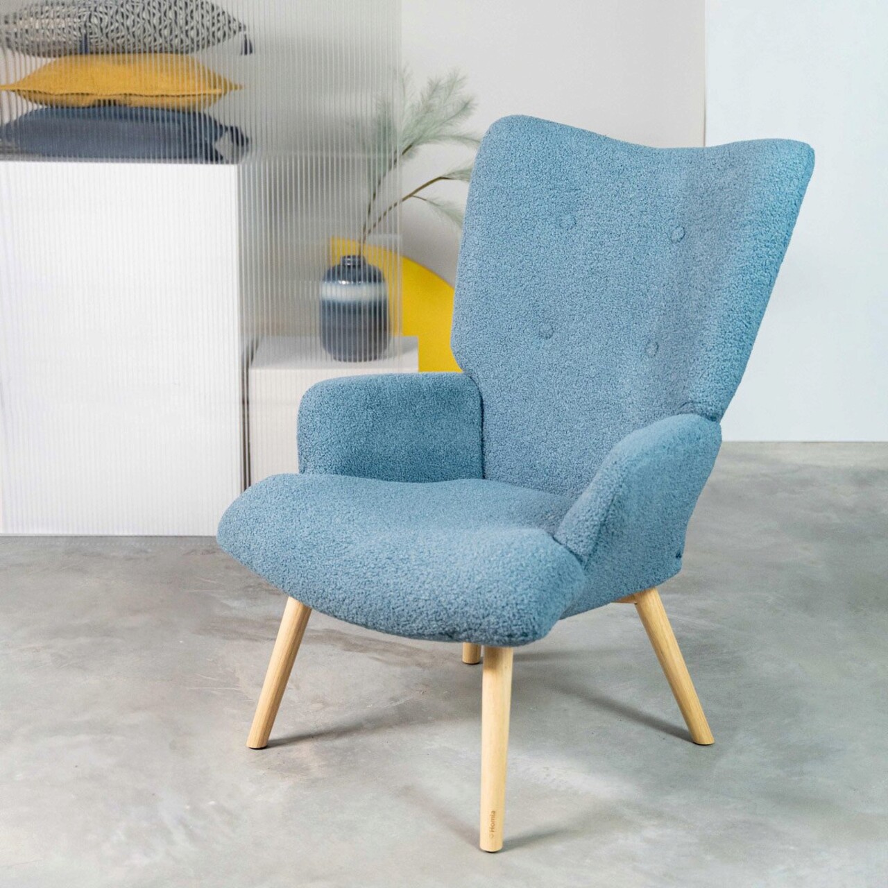 Fotoliu tapitat cu material poliester Teddy Boucle durabil, placut la atingere si rezistent la abraziune. Picioarele si cadrul fotoliului sunt din lemn si ofera stabilitate.