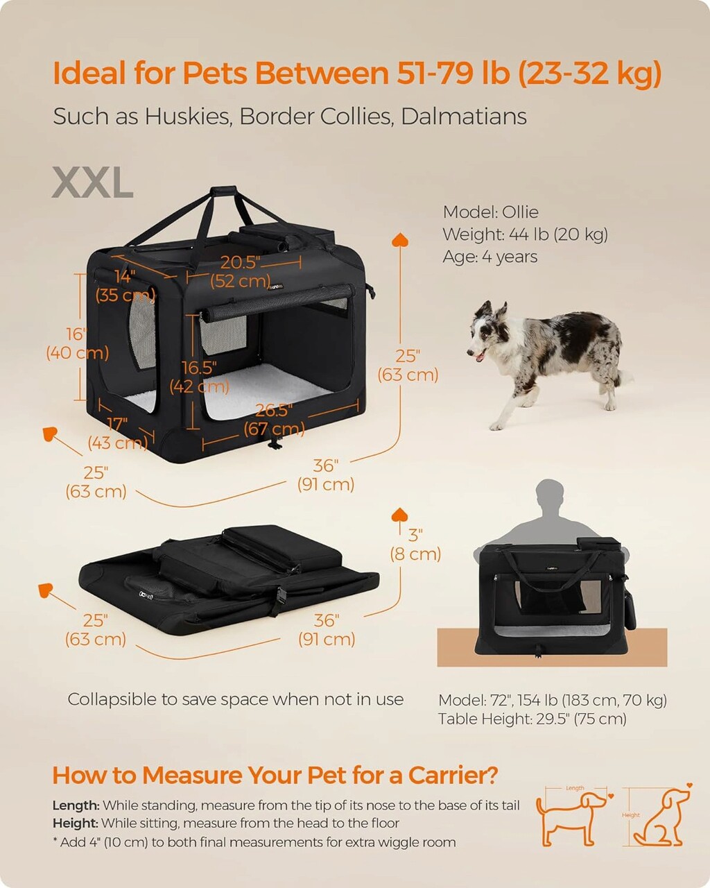 Stabiliti dimensiunea potrivita Geanta pentru caini (91 x 63 x 63 cm) este potrivita pentru caini cu o greutate de pana la 32 kg. Rase recomandate: Huskies, Foxhounds, Border Collie, etc. Va rugam sa consultati instructiunile pentru metoda corecta de masurare.