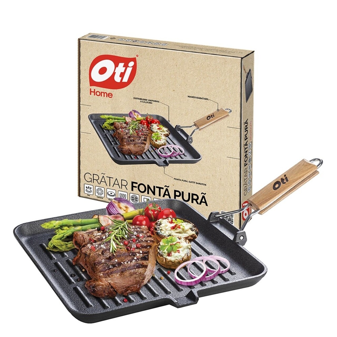 Gratarul din fonta pura are capacitate calorica mare, caldura inmagazinata se distribuie timp indelungat catre preparat, in mod constant si uniform.Mancarea capata astfel un gust delicios, pastrandu-si totodata calitatile nutritive.Cu un maner pliabil, gratarul din fonta pura de la Oti este usor de manevrat si depozitat, extrem de practic in orice bucatarie.