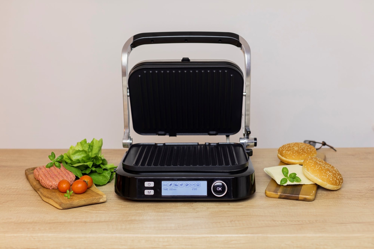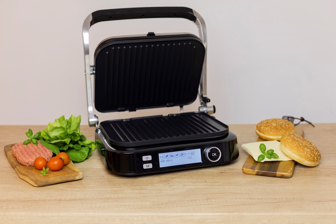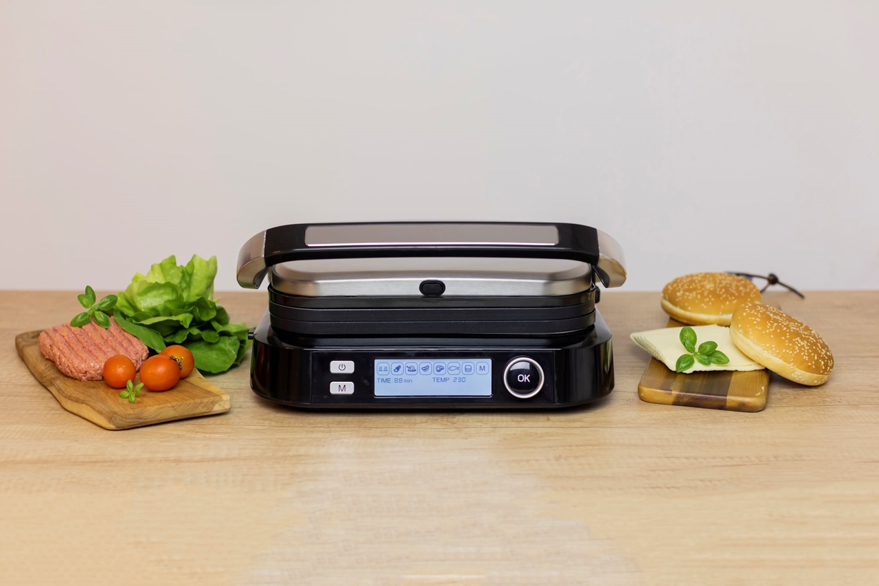 Gratarul electric detecteaza automat grosimea alimentelor(Intr-un interval de 5 secunde)Pentru adaptarea timpului de preparare.Nivelul de gatire a alimentelor este afisat pe panoul digital de control.