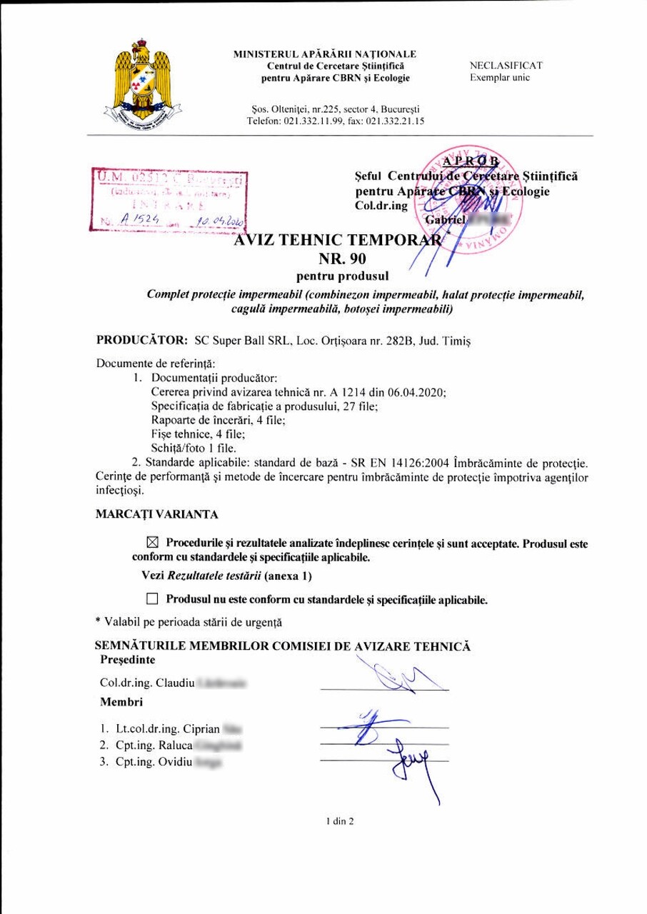 Produs cu certificarea Ministerului Apararii Nationale, standarde aplicabile: SR EN 14126/2004Imbracaminte de protectie. Cerinte de performantasi metode de incercare pentru imbracaminte de protective impotriva agentilor infectiosi.
