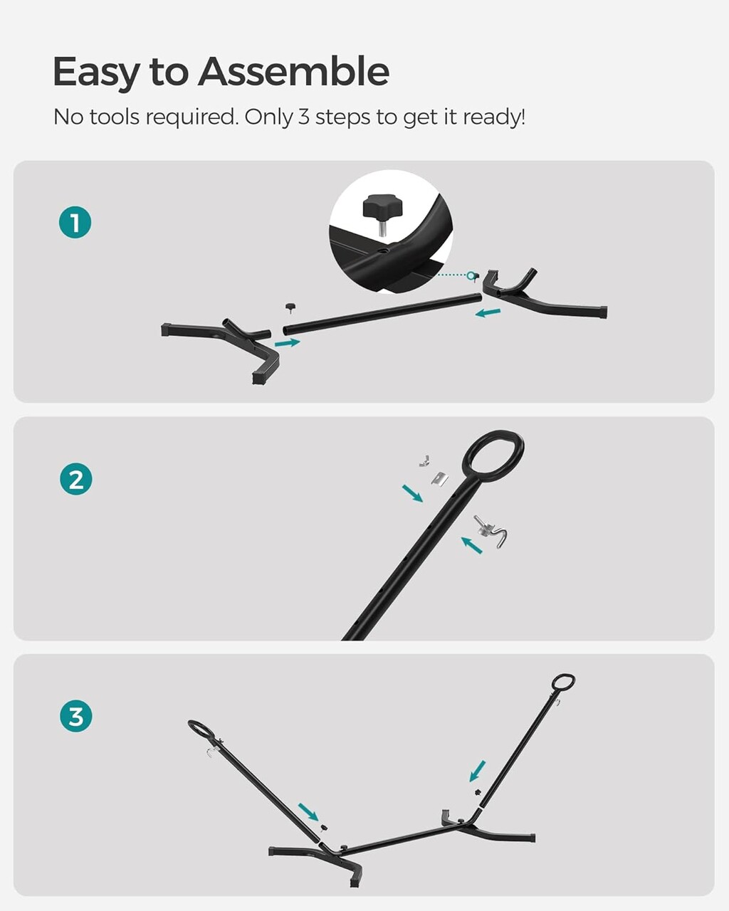 Montaj rapid: Fara unelte si fara batai de cap. Structura simpla iti permite sa montezi rapid suportul hamacului si sa te bucuri de relaxare in cateva minute.