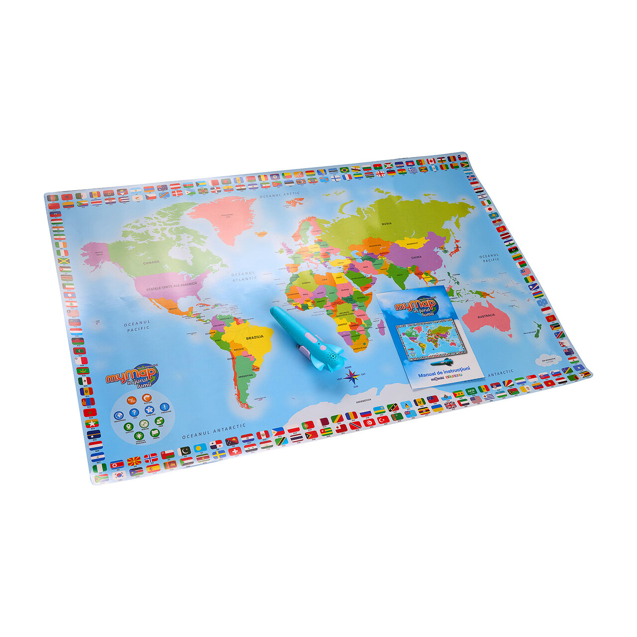 Harta interactiva a lumii bilingv romana + creion interactiv Momki, 90x60 cm, plastic, multicolor