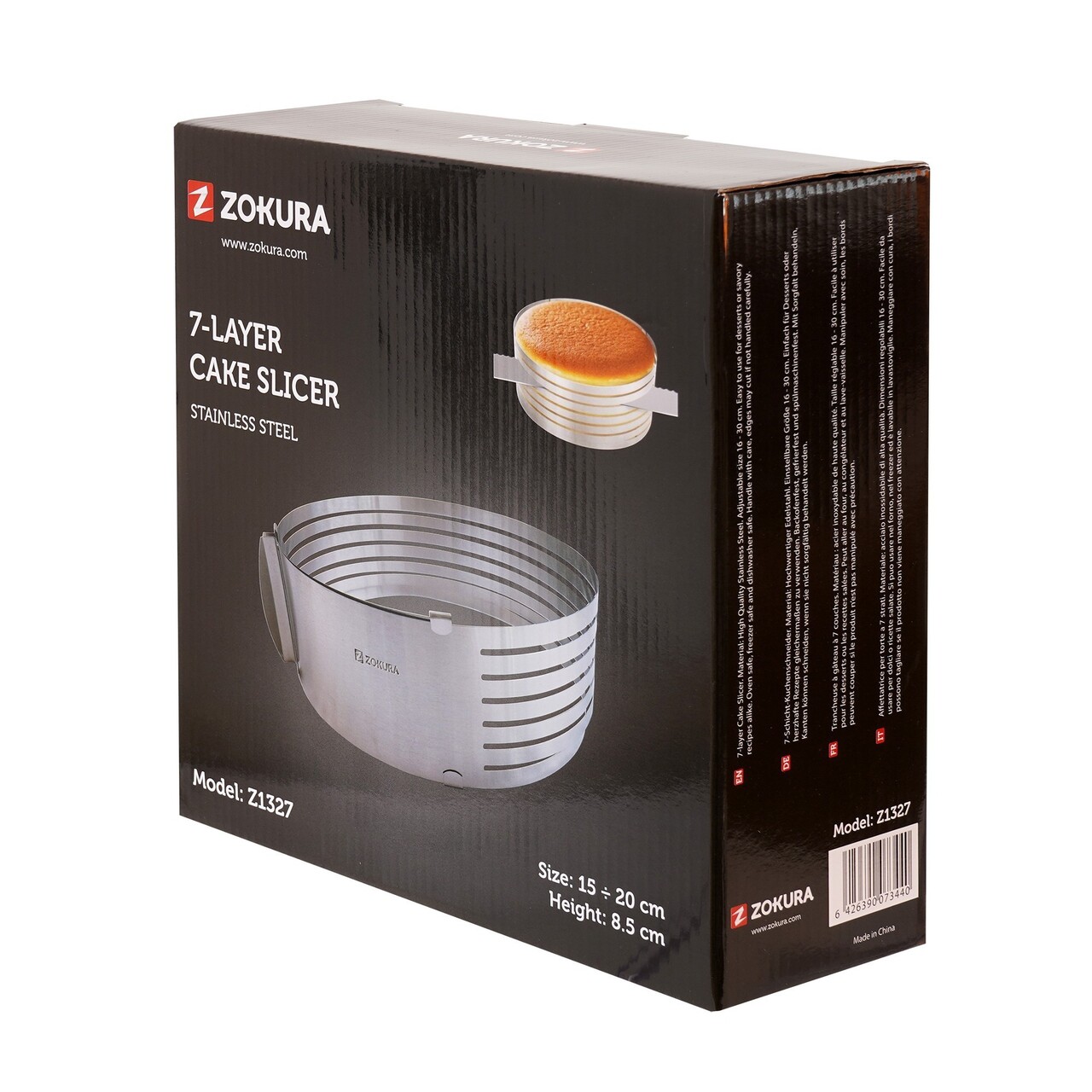 Inel reglabil tort cu feliator compus din 7 straturi, MarcaZokura, DinInox 18/0De inalta calitate cu grosimea de 0,45 mm, cu diametrul reglabil intre 15 si20 cm si o inaltime de 8,5 cm.