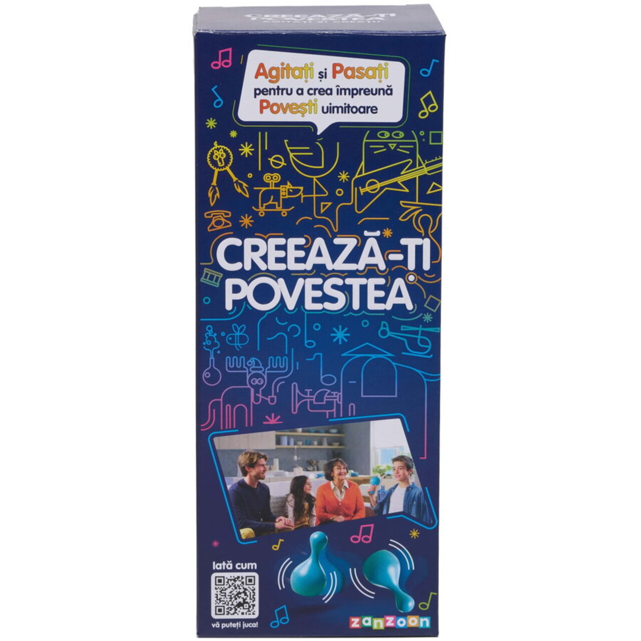 Agitati pentru a auzi un sunet. Folositi-l pentru a incepe sa va creati povestea. Agitati din nou pentru sunete mai inspirate pentru a va continua povestea epica.