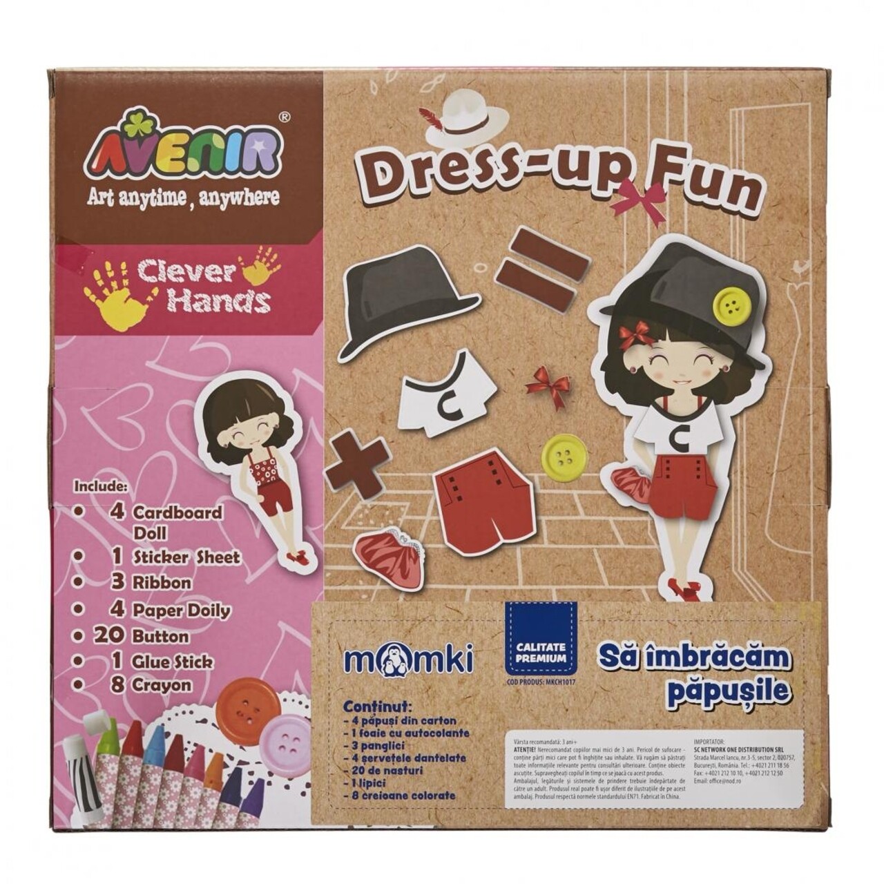 Continut:- 4 papusi din carton- 1 foaie cu autocolante- 3 panglici- 4 servetele dantelate- 20 de nasturi- 1 lipici- 8 creioane colorate
