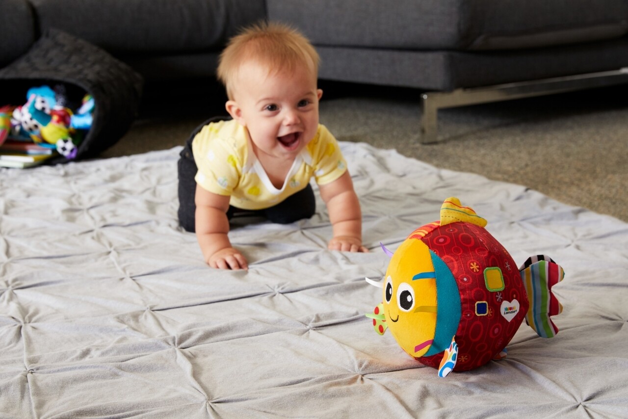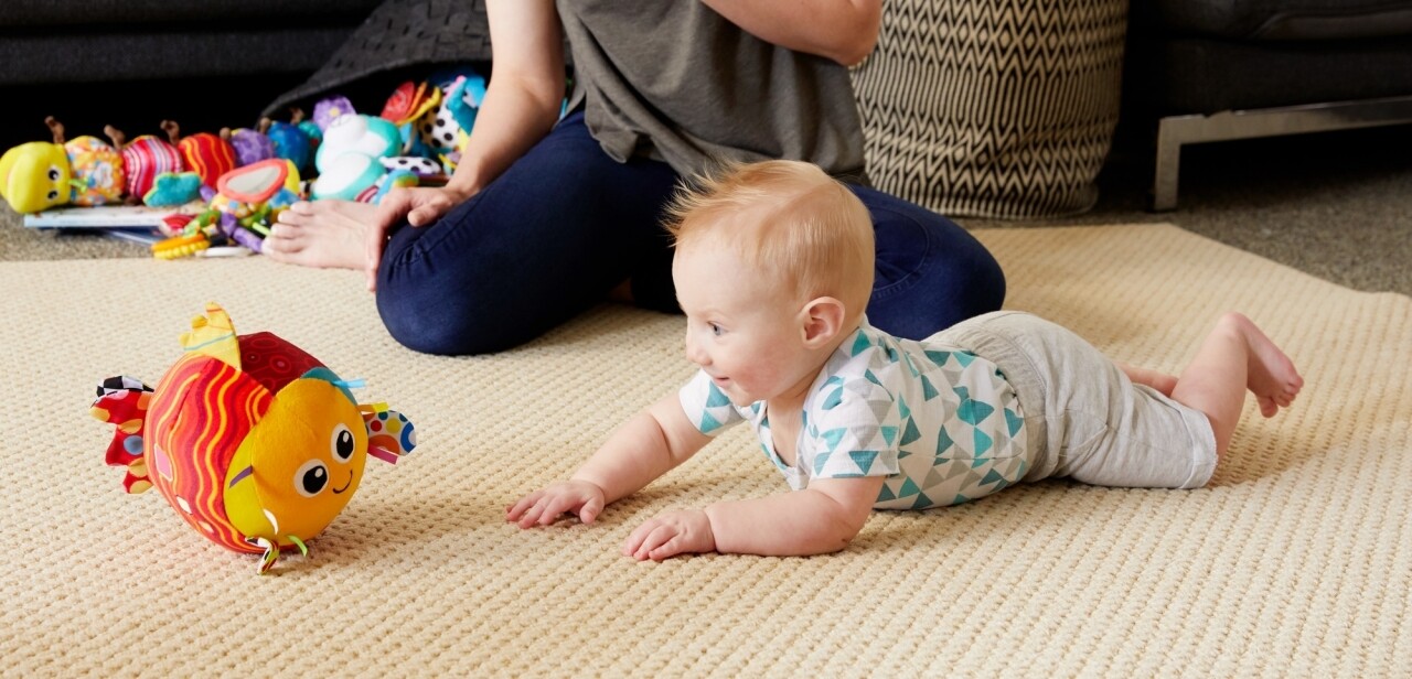 incurajeaza copilul sa se rostogoleasca si sa se tarasca.