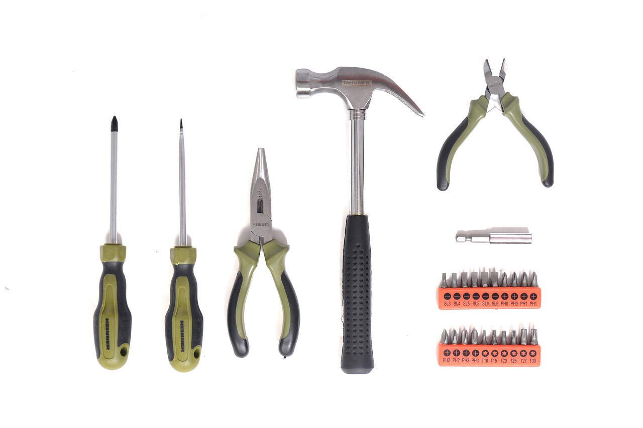 1 incarcator; 1 surubelnita SL6 X 100; 1 surubelnita PH2 X 100; patent cu varf lung 15 cm; patent sfic de 11,5 cm; 20 biti (25L); suport magnetic biti; ciocan 230 grame