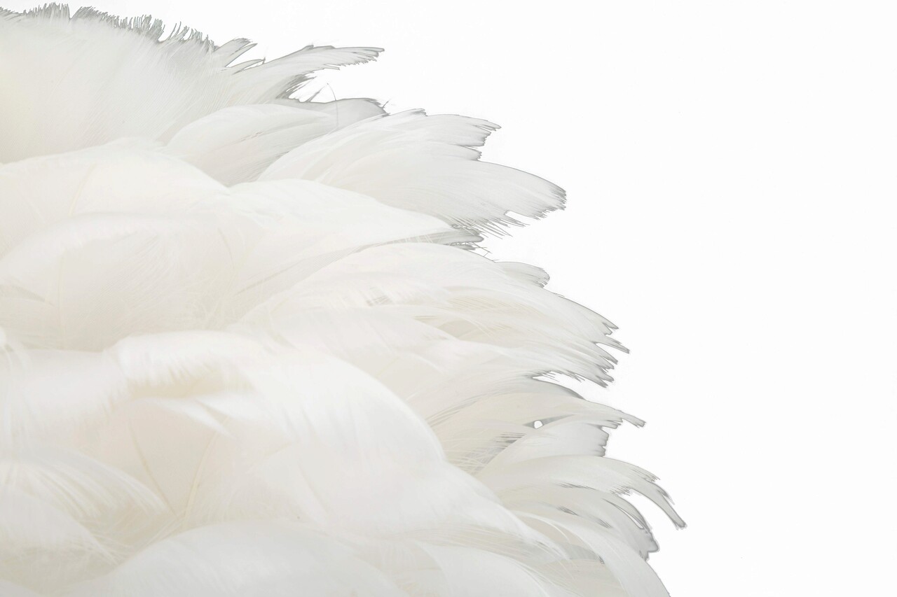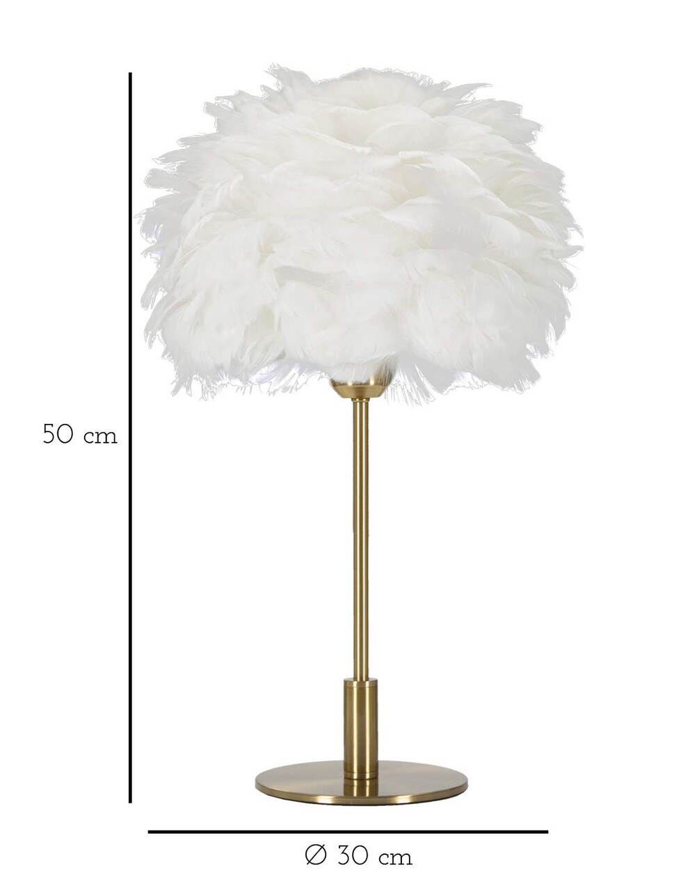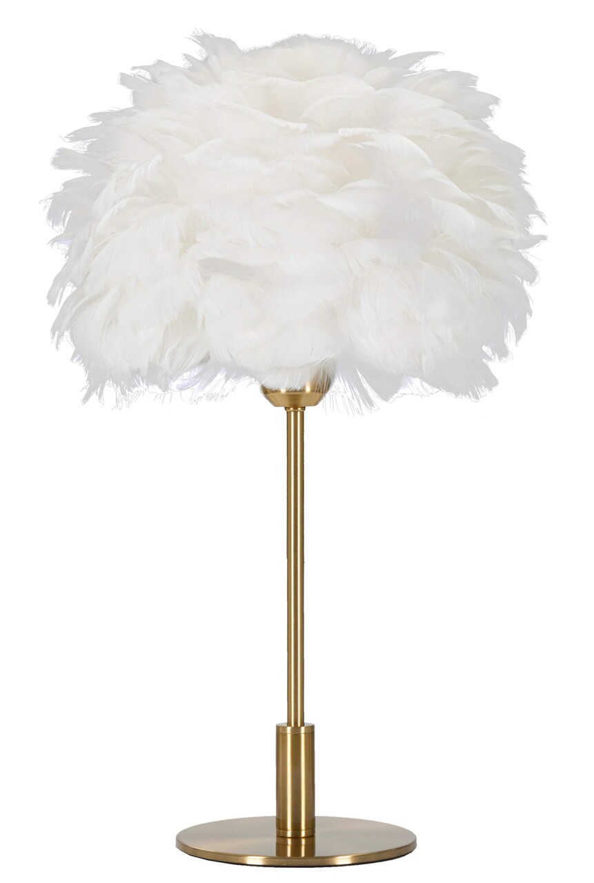 Lampa de masa din metal auriu cu abajur realizat din pene albe.