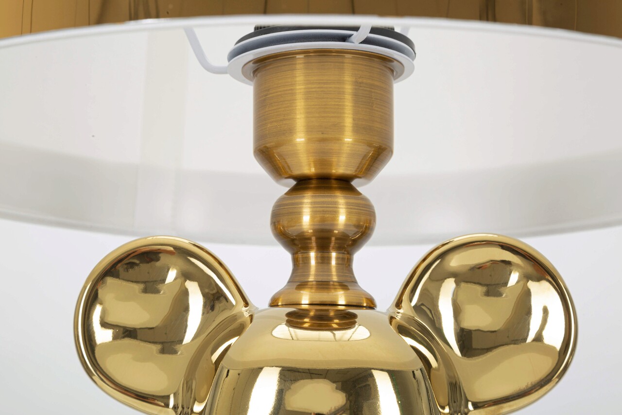 Lampa de masa din ceramica aurie in forma de ursulet simpatic, cu baza rotunda. Completata cu un abajur din tesatura bej cu banda aurie eleganta.
