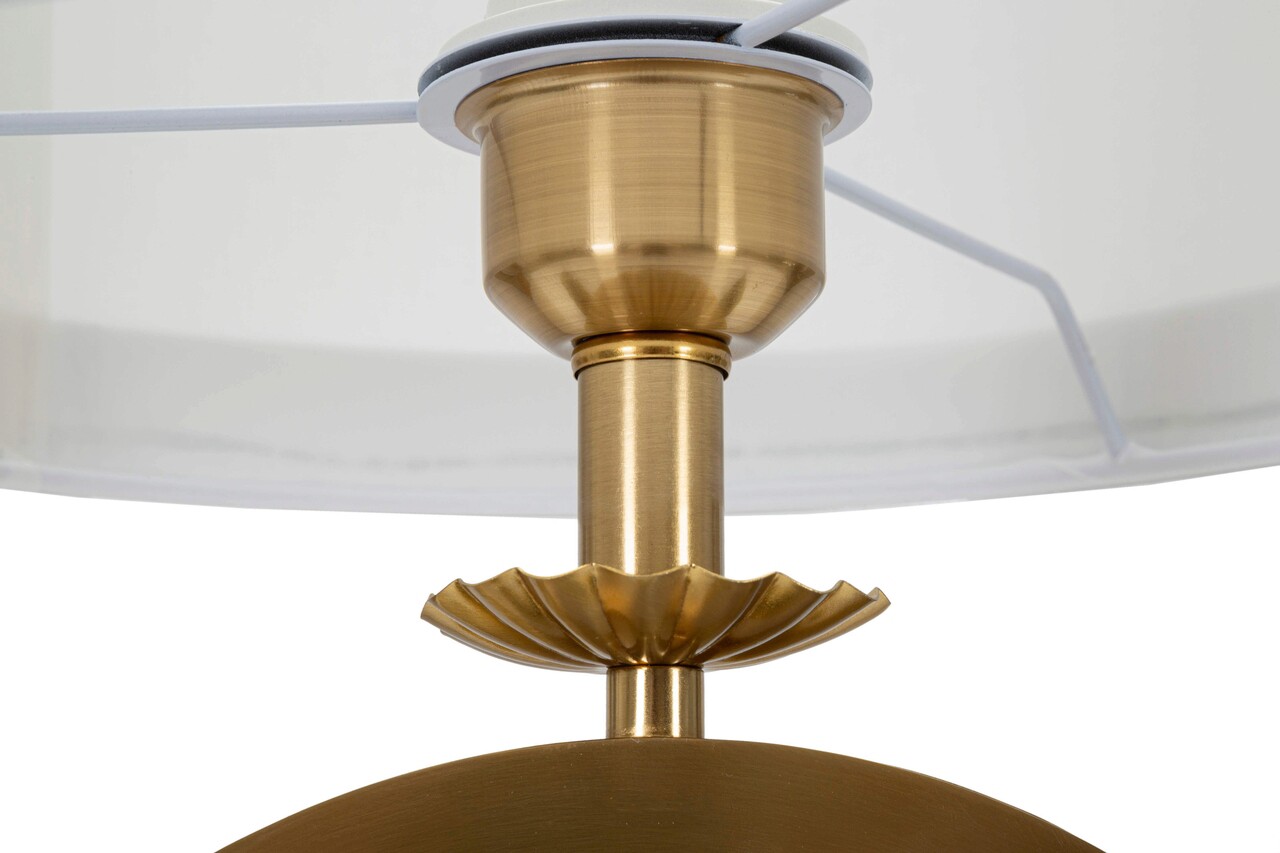 Lampa de masa din metal auriu cu decor geometric elegant, completata cu abajur din tesatura alba cu margine aurie.