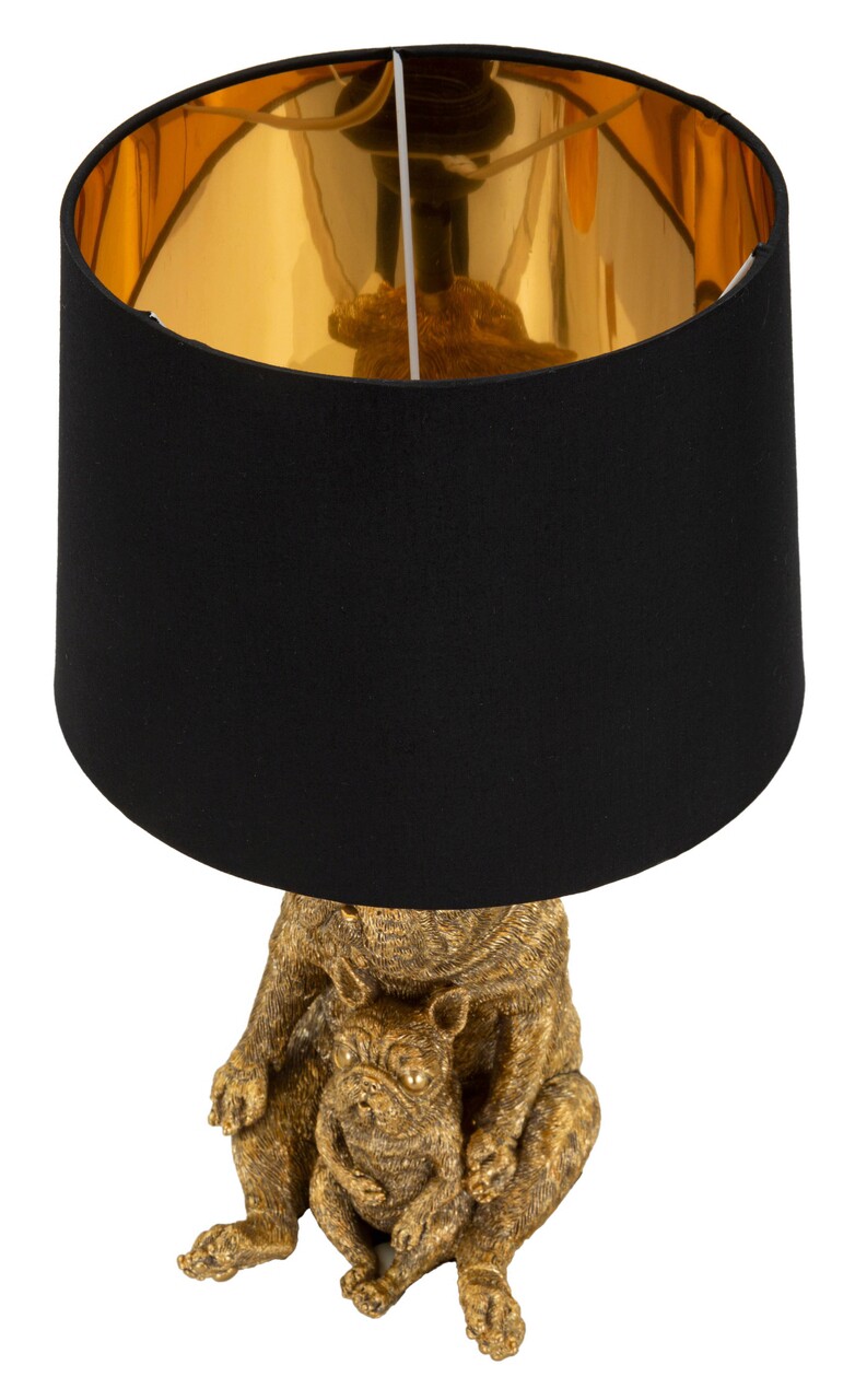 Lampa de masa din polirasina aurie in forma de pereche de caini. Completat cu abajur din tesatura neagra.