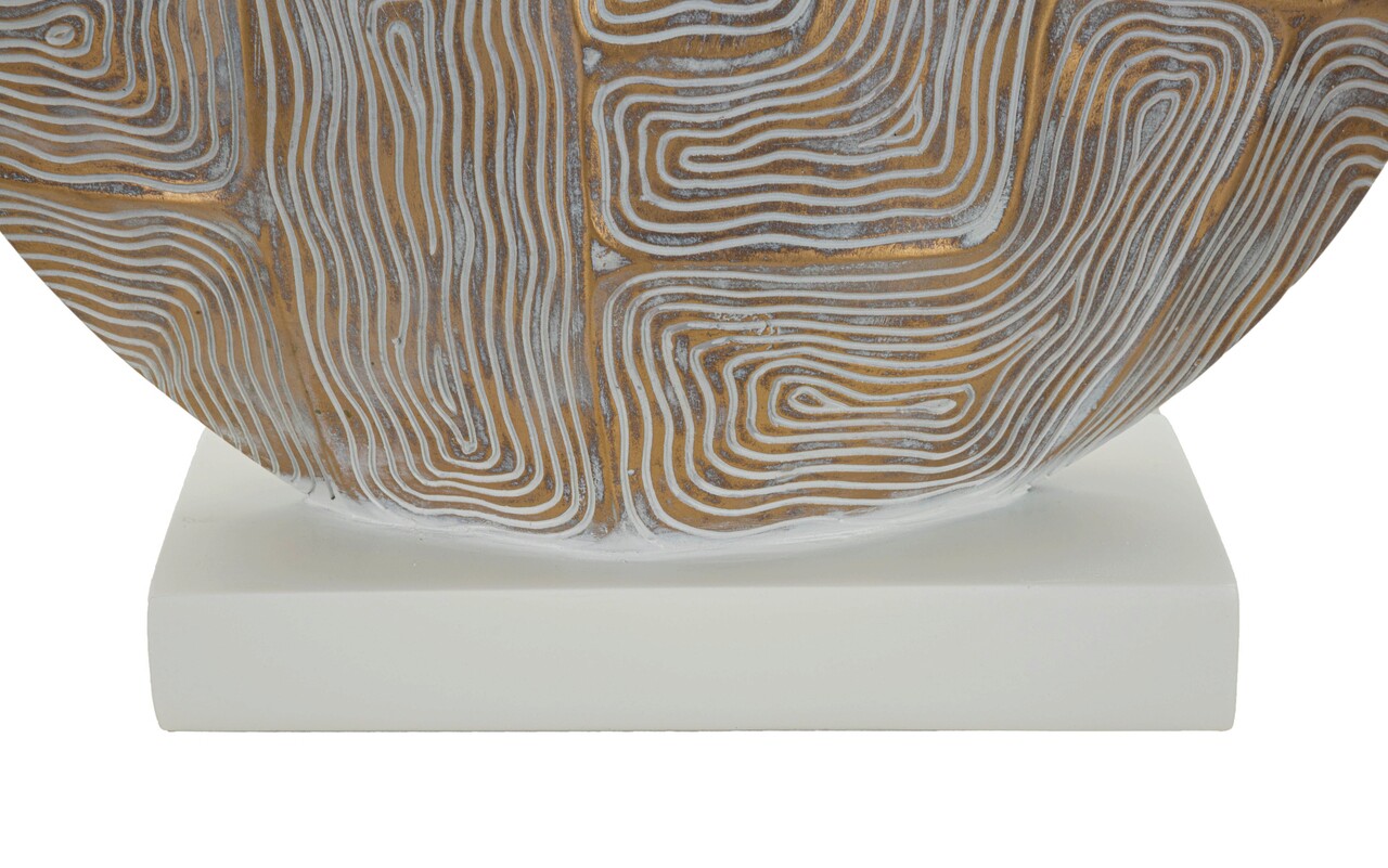 Lampa de masa din polirasina cu decoratiuni geometrice elegante in relief. Completata cu abajur din tesatura bej.