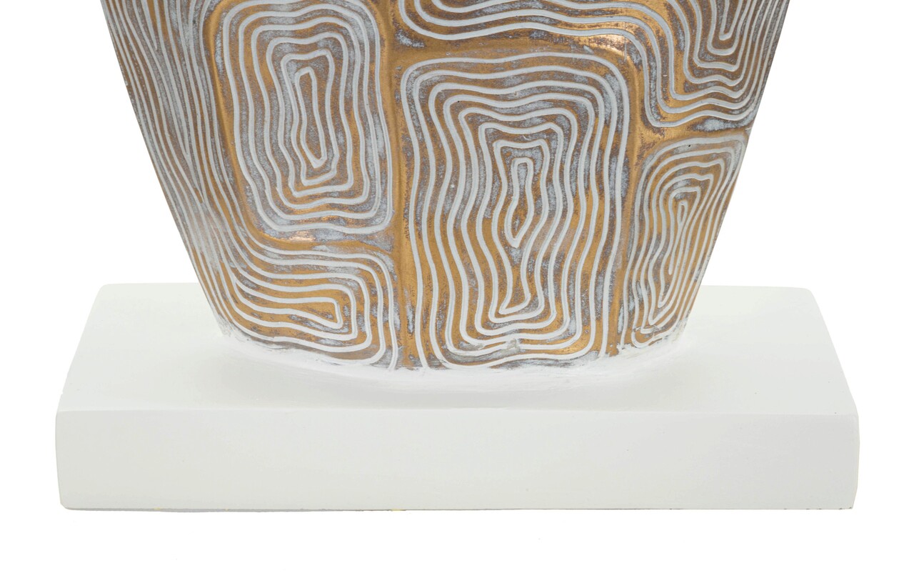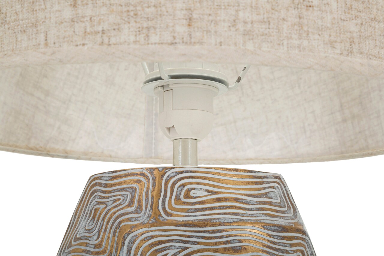 Lampa de masa din polirasina cu decoratiuni geometrice elegante in relief. Completata cu abajur din tesatura bej.