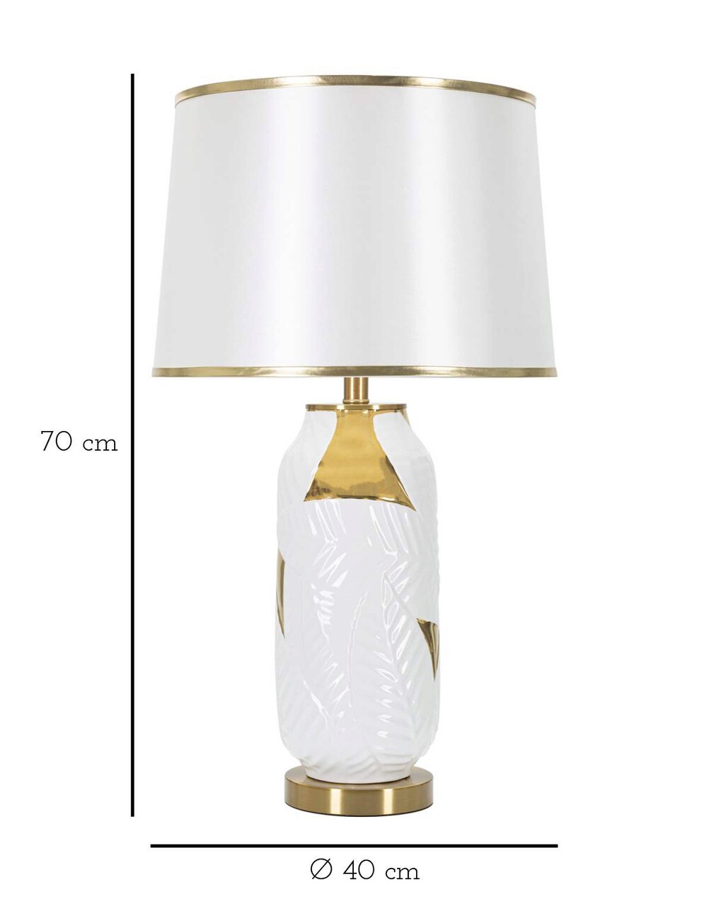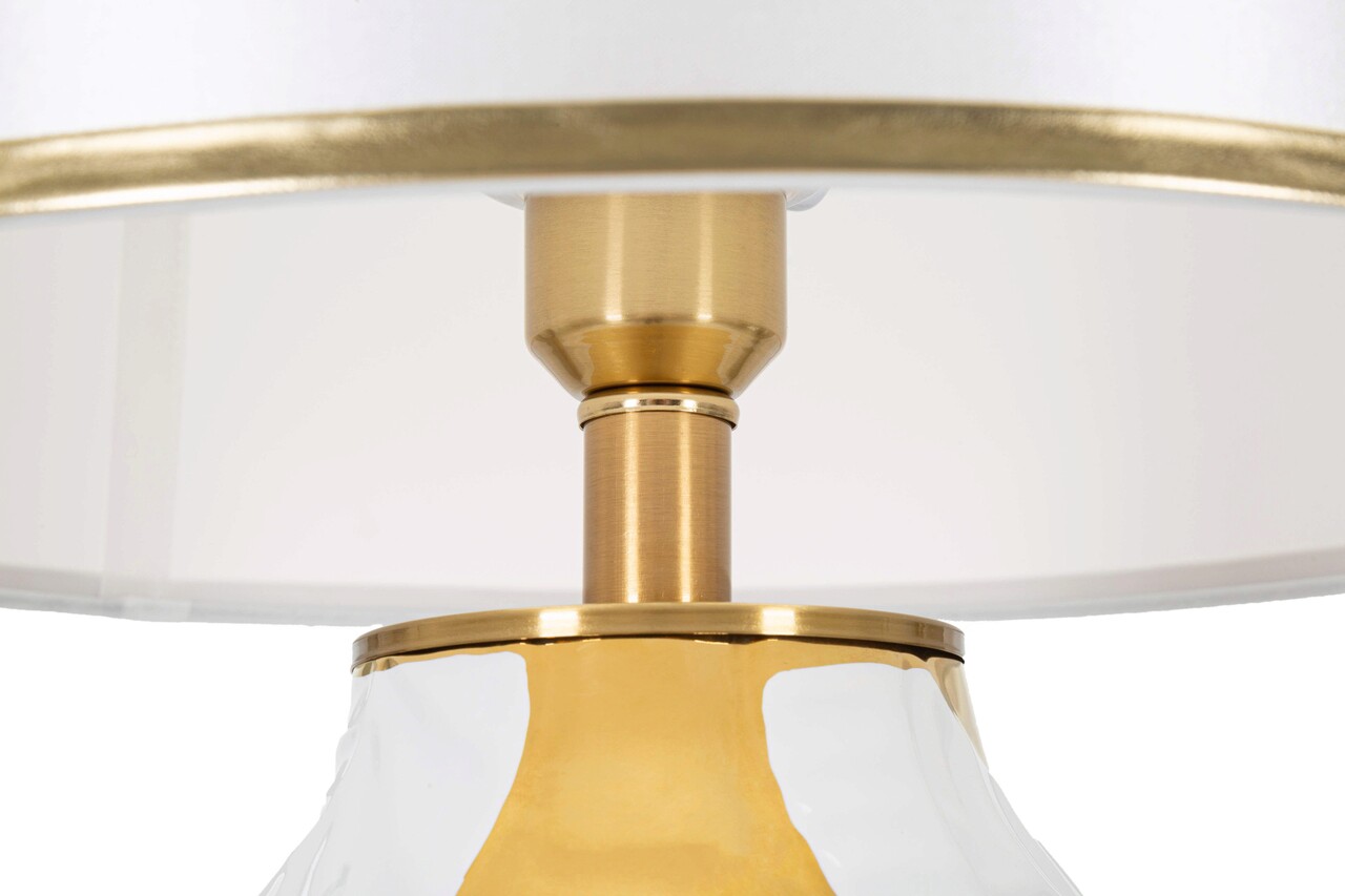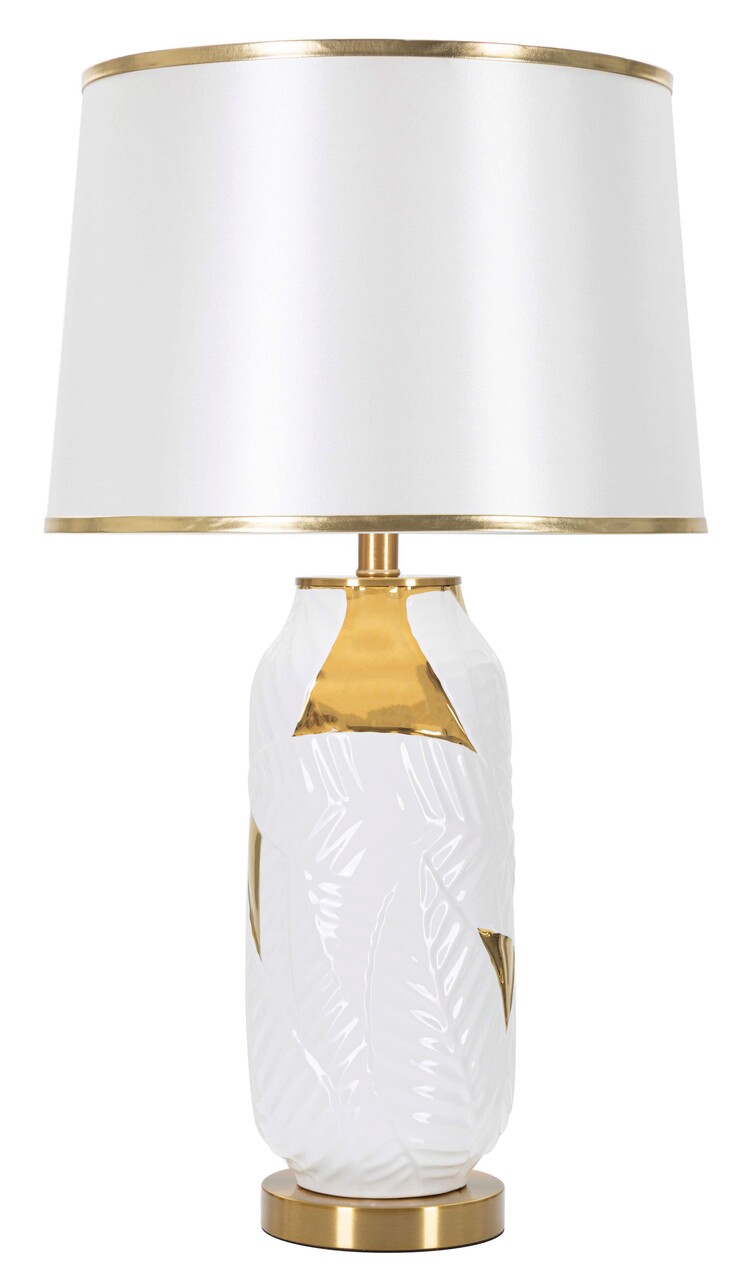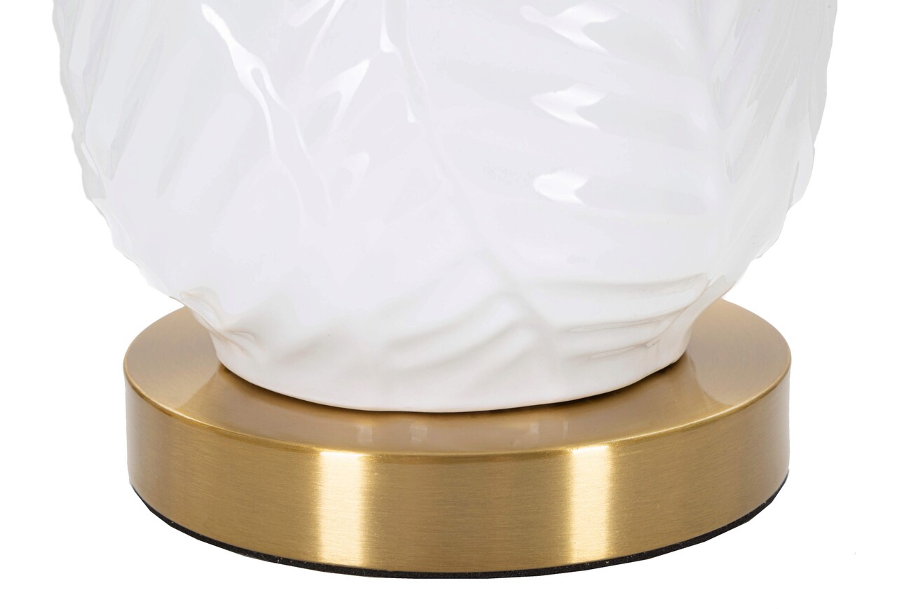 Lampa de masa din ceramica alba si aurie decorata cu frunze elegante, completata cu abajur din tesatura alba cu margini aurii.