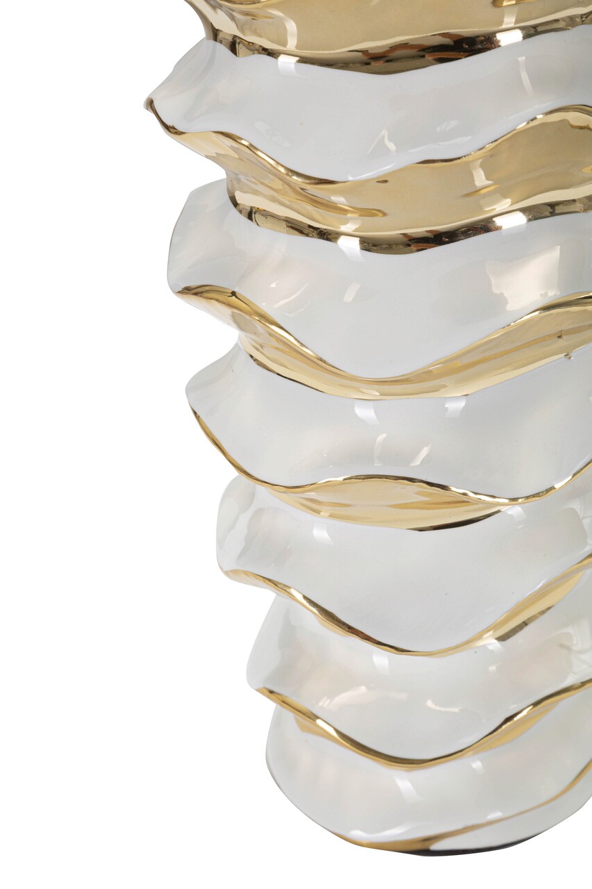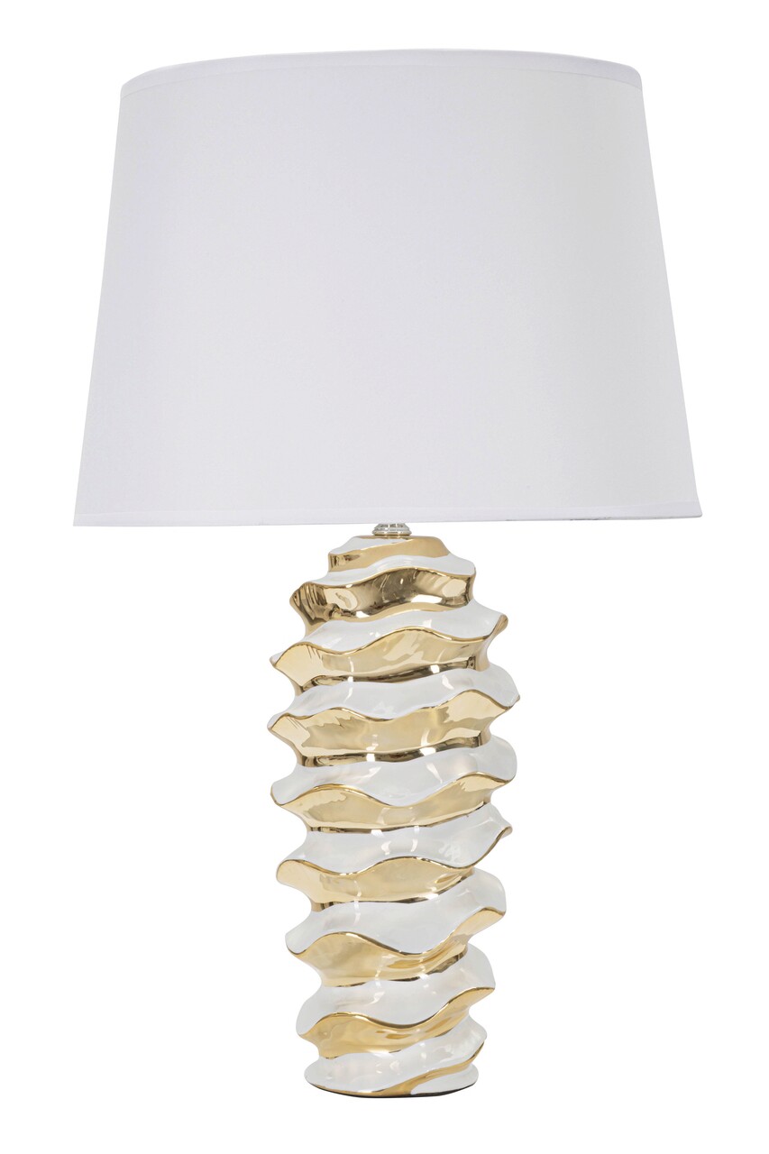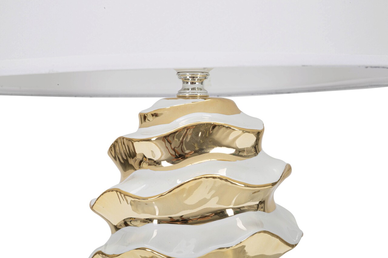 Lampa de masa din ceramica alba si auriu, cu un design care aminteste de un stup de albine. Completata cu abajur din tesatura alba.