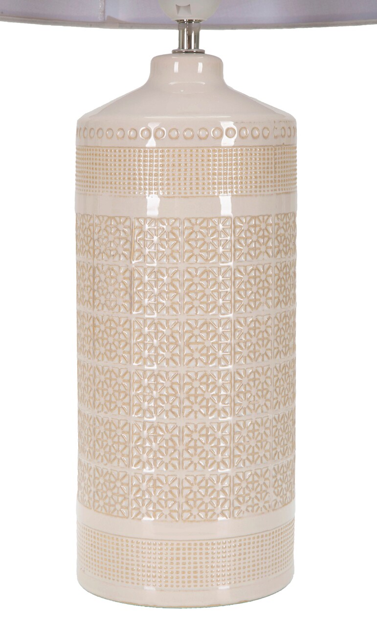 Lampa de masa din ceramica cu decoratiuni geometrice elegante in relief. Echipata cu abajur din tesatura alba.