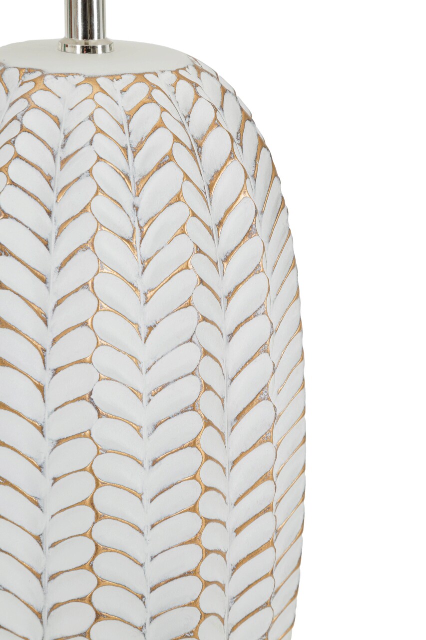 Lampa de masa din polirasina cu decoratiuni florale elegante in relief. Completata cu abajur din tesatura alba.