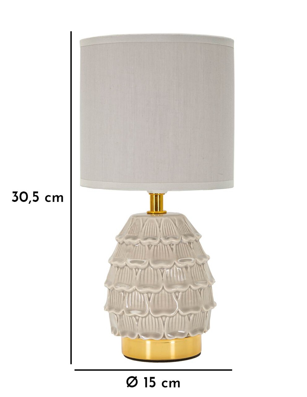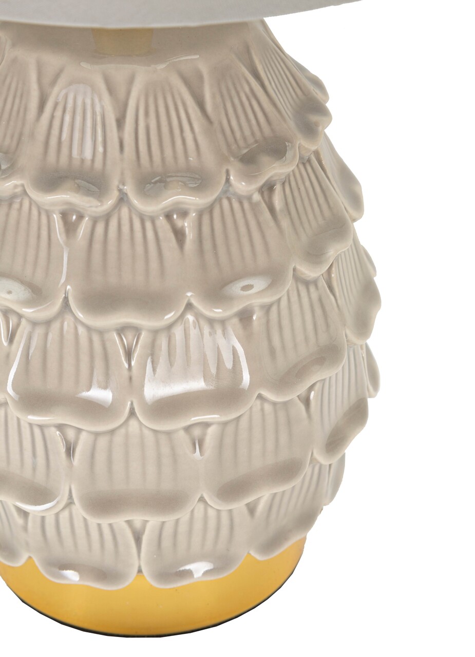 Lampa de masa cu baza crem in forma de con de pin, design elegant si unic, perfecta pentru a adauga o nota de stil si originalitate dormitorului dumneavoastra.