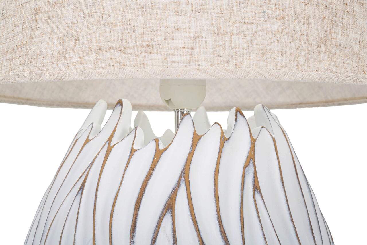 Lampa de masa din polirasina cu decoratiuni liniare elegante in relief. Echipata cu abajur din tesatura bej.