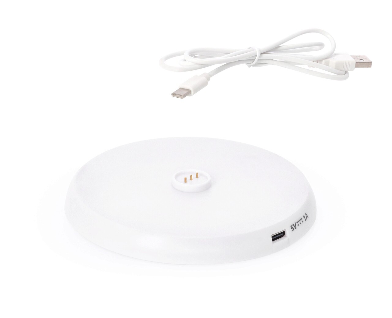 Baterie reincarcabila cu baza de incarcare din plastic alb si cablu USB de 80 inclus.