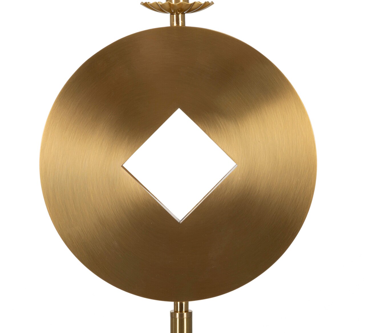 Lampadar din metal auriu cu decor geometric elegant, completat de abajur din tesatura alba cu margine aurie.