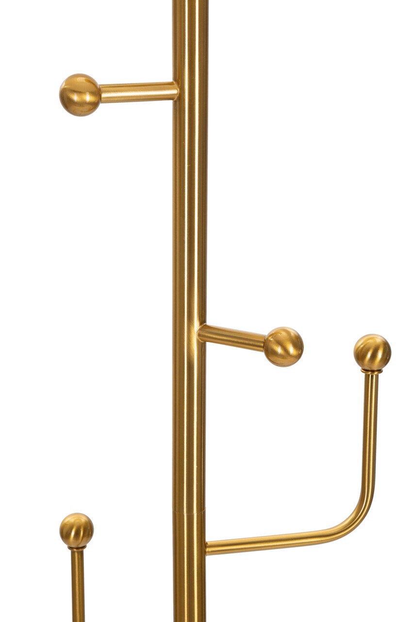 Lampadar din metal auriu cu baza din marmura, cu un design simplu si original, echipat cu 5 agatatori pentru haine. Completat cu un abajur din tesatura alba cu ornament elegant auriu.