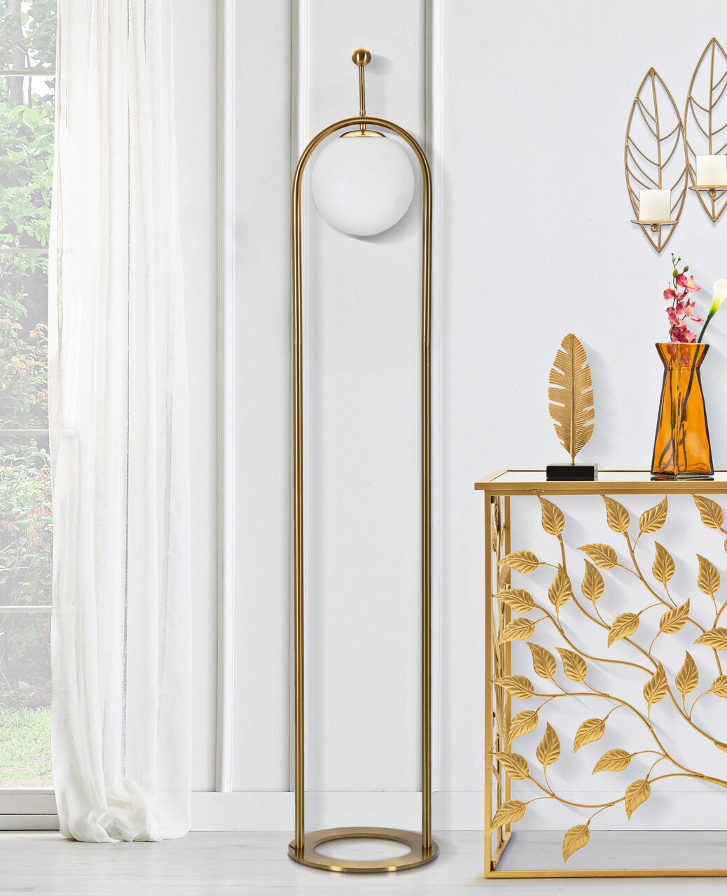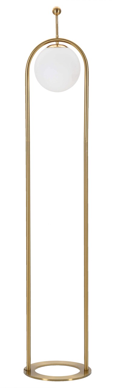 Lampadar din metal auriu cu linii simple si un abajur elegant cu sfere din sticla alba.