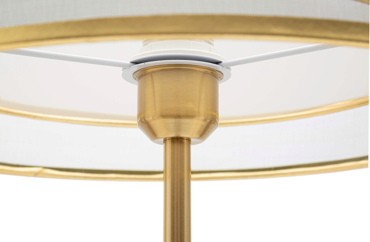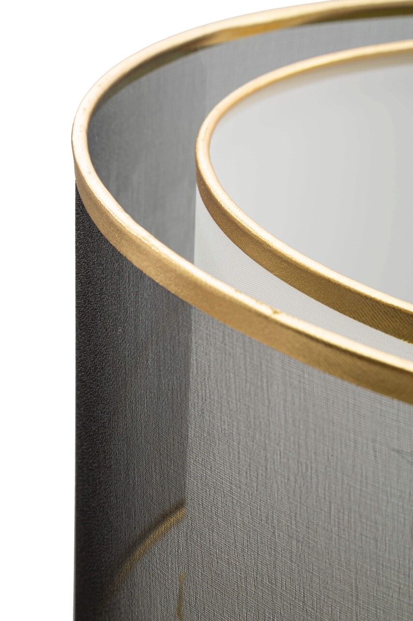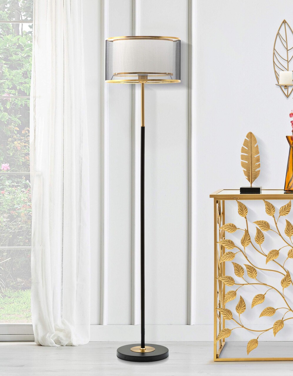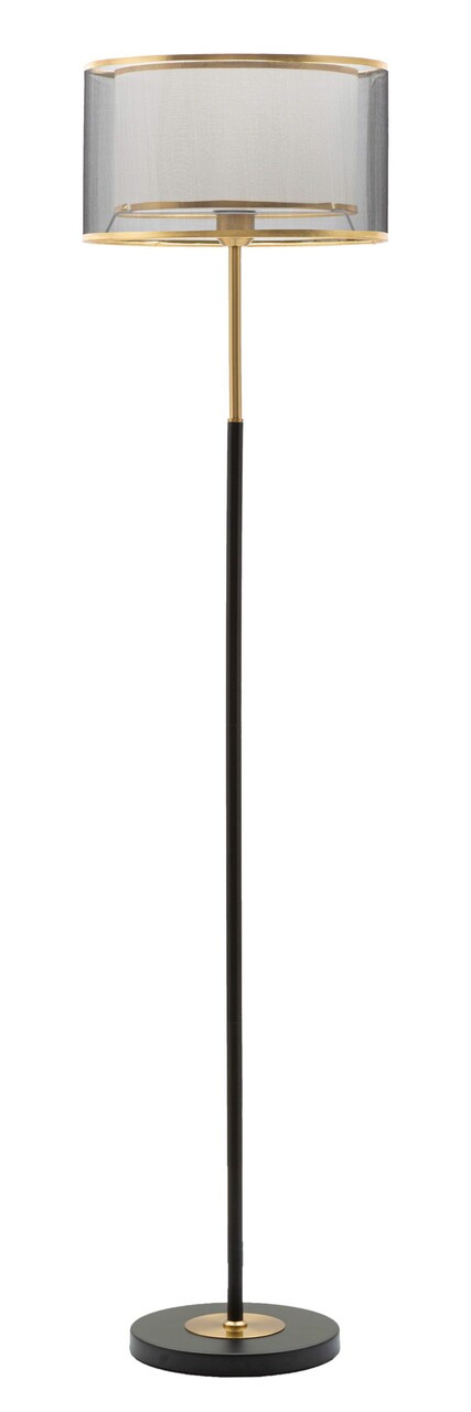 Lampadar din metal negru si auriu, cu abajur din tesatura pe doua niveluri, cel intern este alb, iar cel extern este gri transparent, ambele cu o margine aurie eleganta.