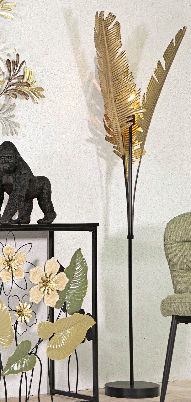 Lampadar din fier auriu cu baza rotunda cu un design inspirat de frunzele de palmier.