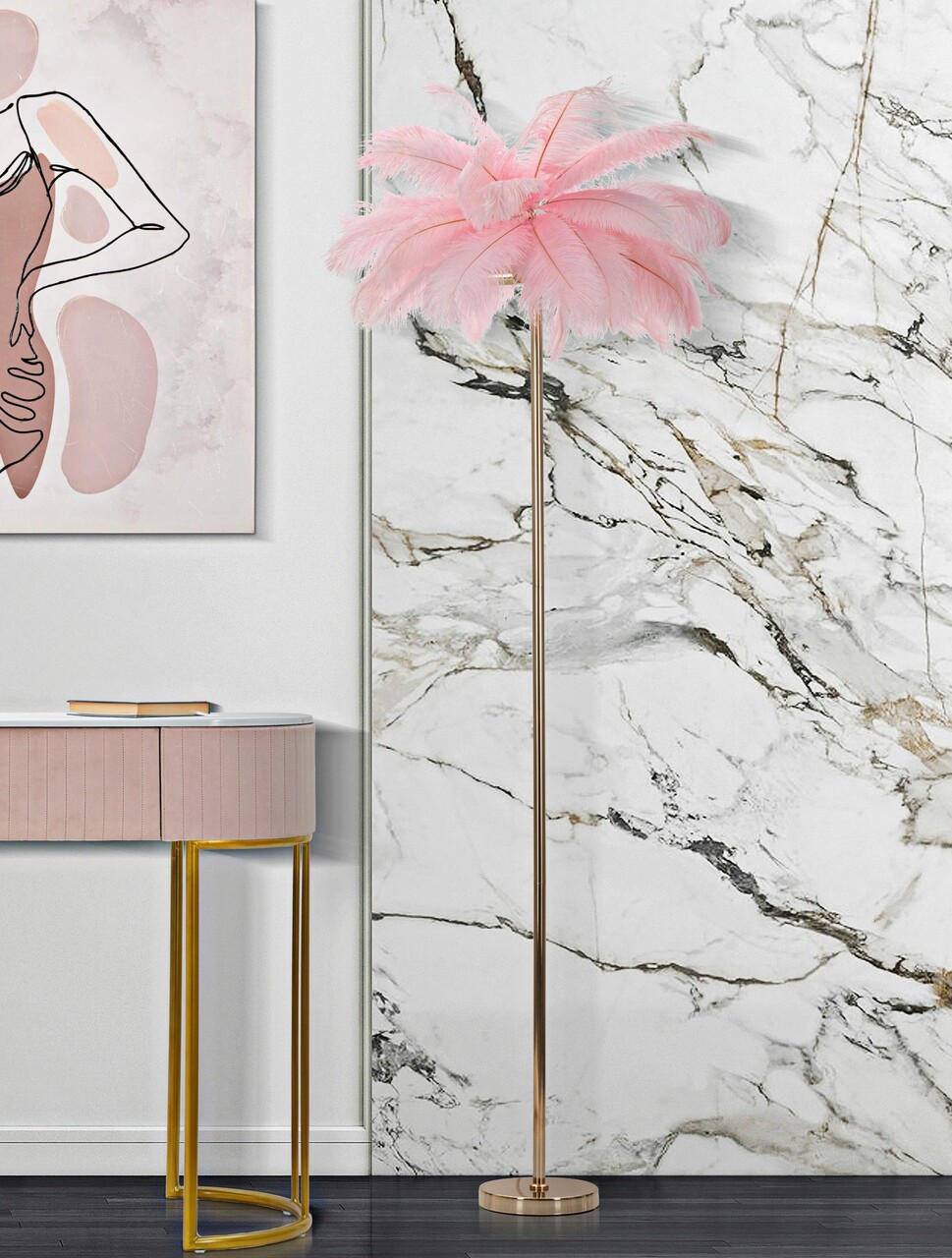 Lampadar din metal auriu cu 3 becuri si abajur din pene roz.