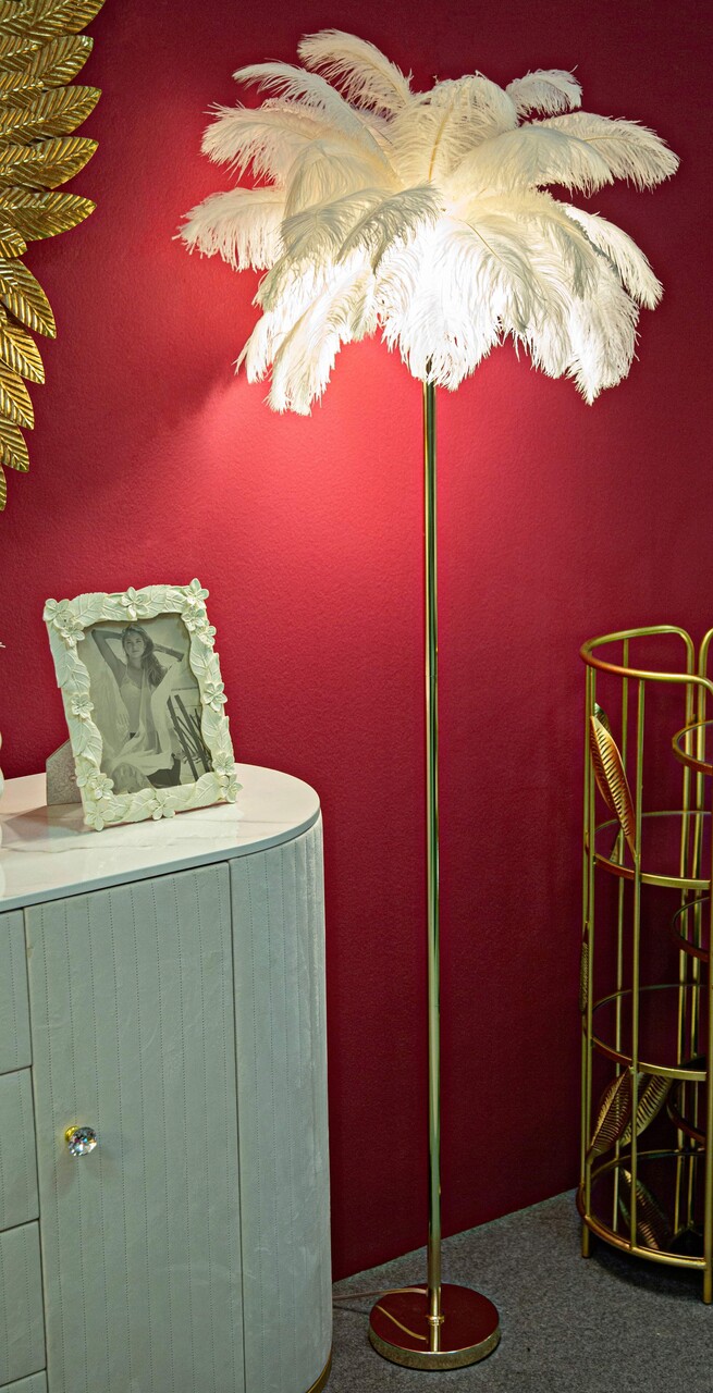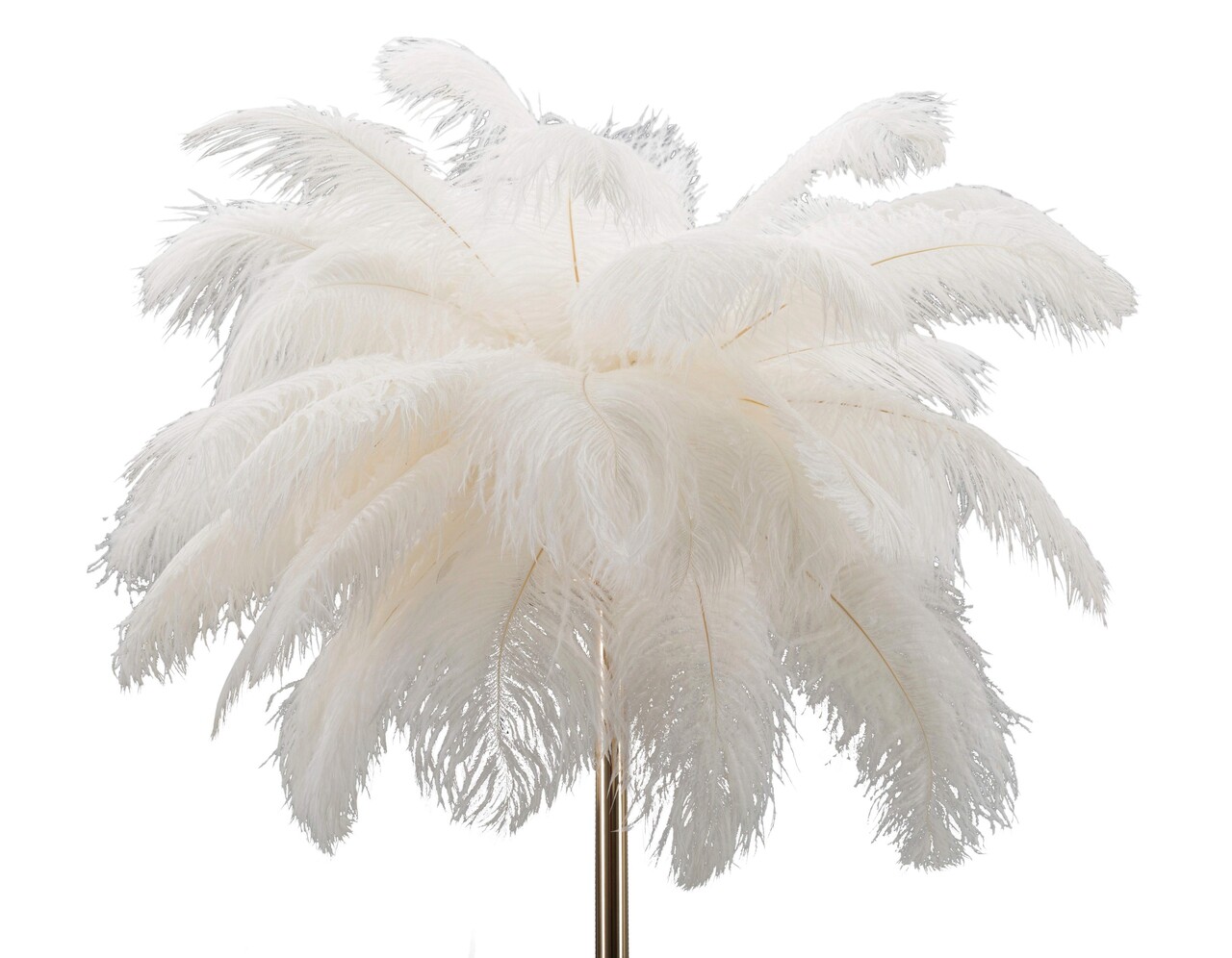 Lampadar din metal auriu cu 3 becuri si abajur format din pene albe.