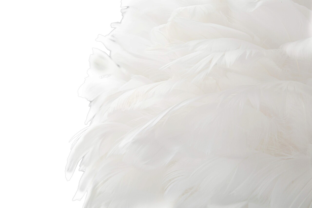 Lampadar din metal auriu cu decor elegant si sinuos, completat cu abajur din pene.