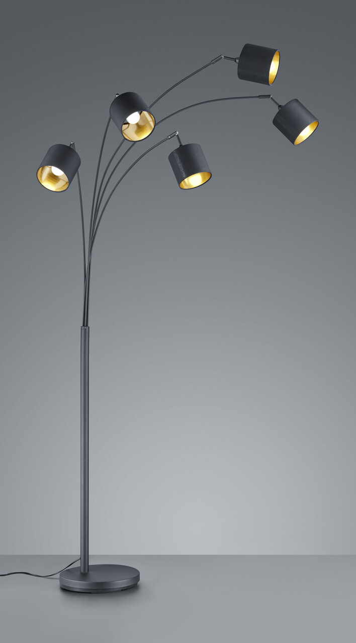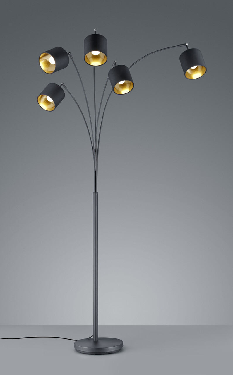 Lampadarul TOMMY ofera o iluminare confortabila deoarece abajururile textile sporesc factorul de confort si creeaza o ambianta intima. In acelasi timp, formele clare evoca un stil modern si simplu care poate fi utilizat si combinat intr-o varietate de moduri. Corpul de iluminat cu cinci puncte de lumina are o inaltime de 200 cm si face ca colturile intunecate sa straluceasca intr-o noua splendoare. Este ideal ca sursa de lumina de sustinere si poate fi utilizat in spatii de locuit moderne. Capetele pivotante pot fi, de asemenea, aliniate pentru a evidentia in mod deliberat zone individuale. Corpul de iluminat este fabricat din metal negru mat si este completat de cinci abajururi din material textil in combinatia moderna de culori negru si auriu. Combinatia creeaza accente de iluminare elegante si confera spatiilor de locuit un efect extraordinar de bunastare. Pentru o iluminare moderna si fiabila, se recomanda utilizarea unui bec LED. Ofera o calitate inalta a luminii, este versatila si convinge prin iluminarea uniforma. Durata lunga de viata si generarea redusa de caldura o fac alegerea ideala pentru o gama larga de aplicatii.
