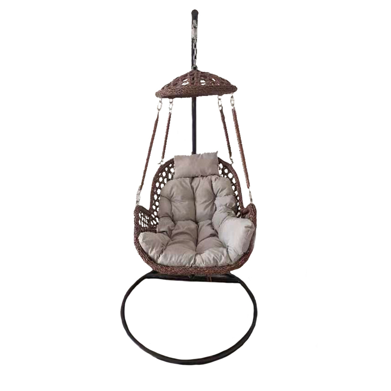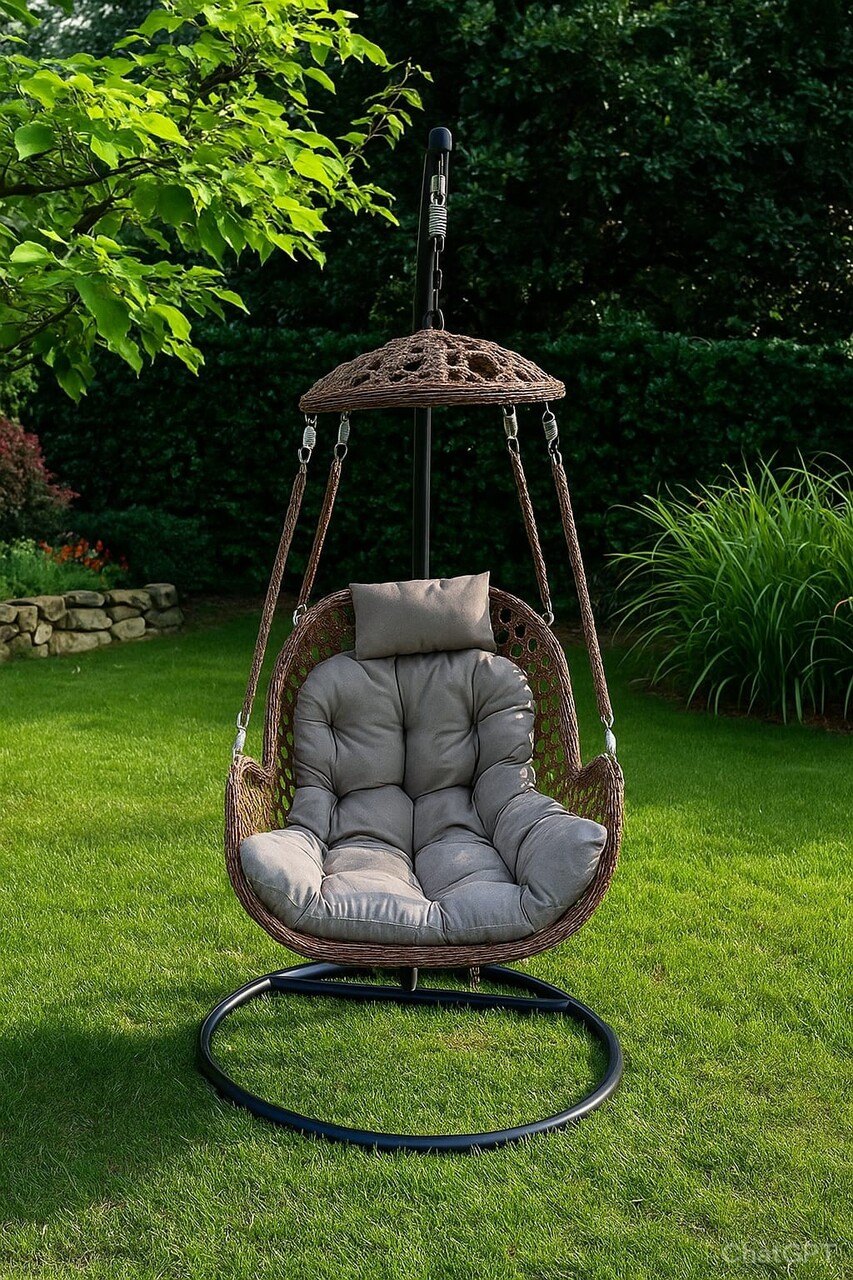 Material: tub de otel, impletitura ratan plastic cu acoperis, tesatura perna impermeabila, arcul si lantul sunt zincate