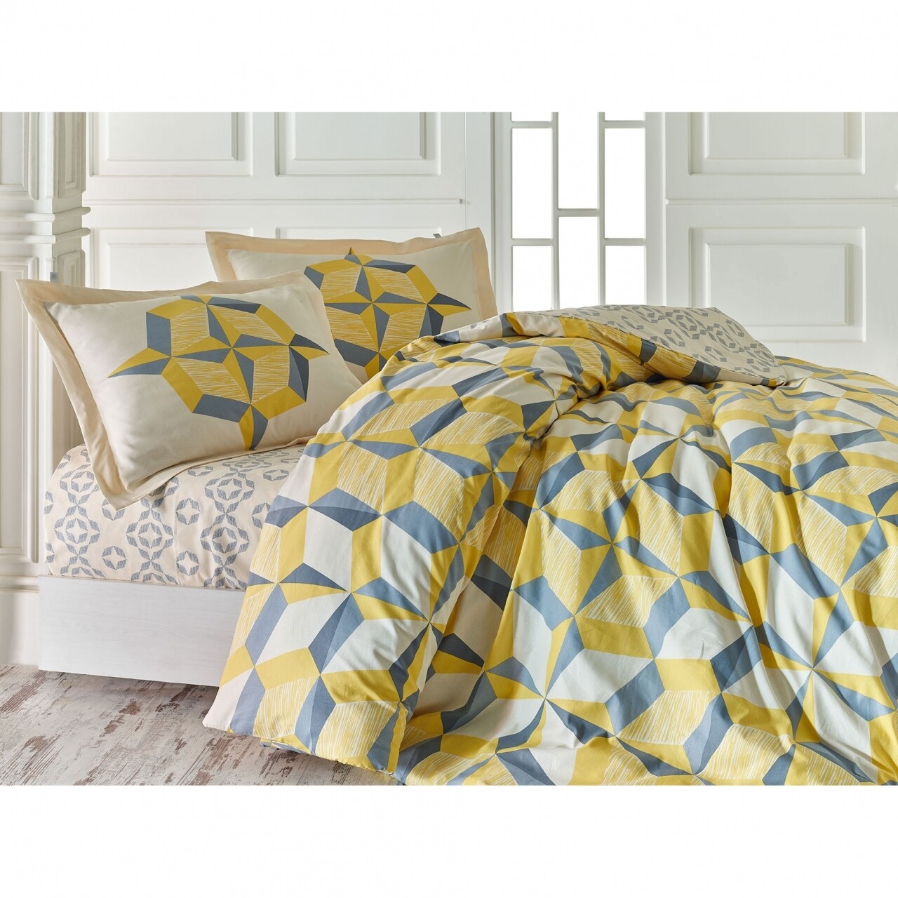 1 cearceaf pilotă 200x220 cm, 1 cearceaf de pat cu elastic 240x260 cm, 2 fețe de pernă 50x70 cm