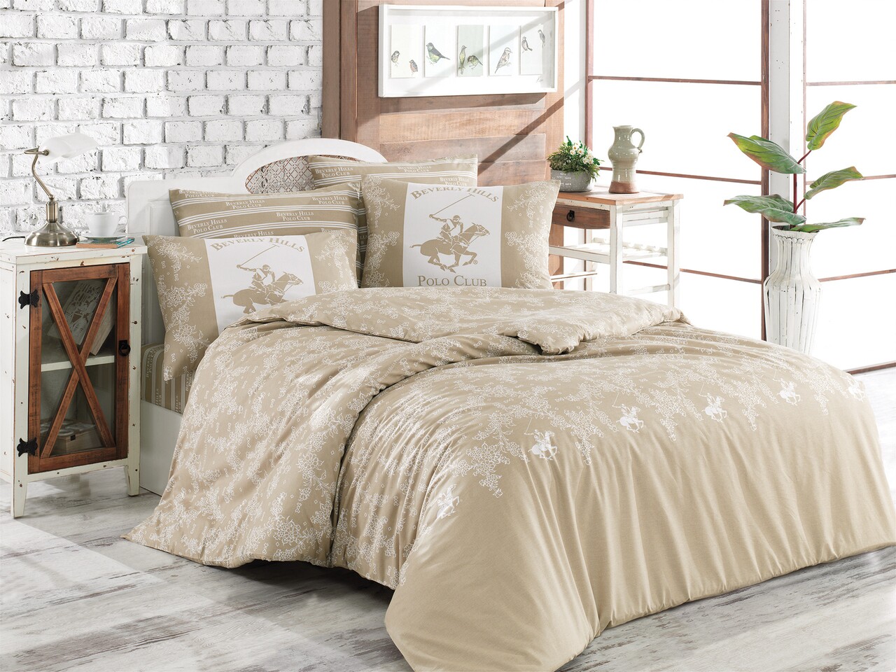 Lenjerie de pat dubla, 3 piese, 200x200 cm, 100% bumbac ranforce, Beverly Hills Polo Club, BHPC 013, crem