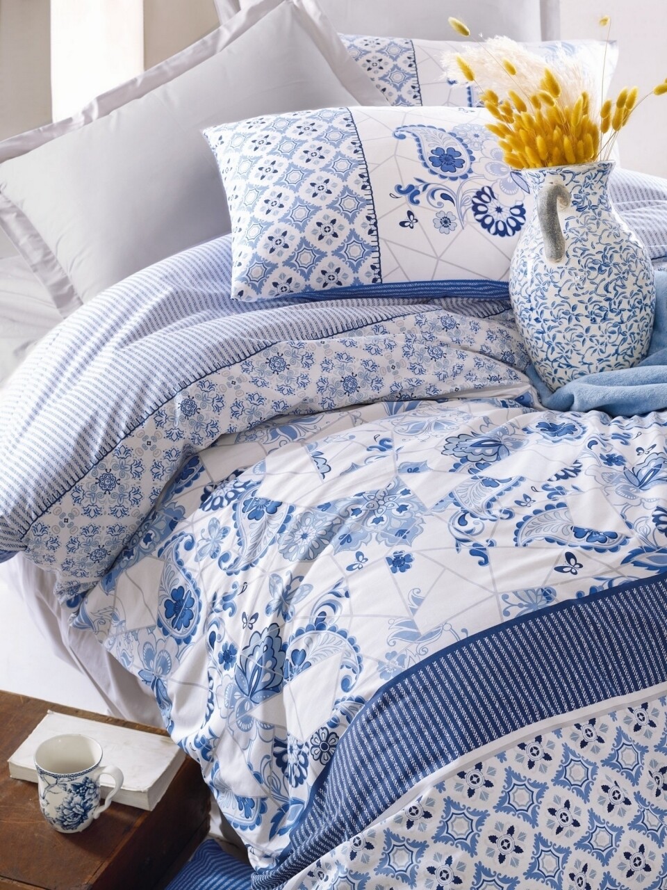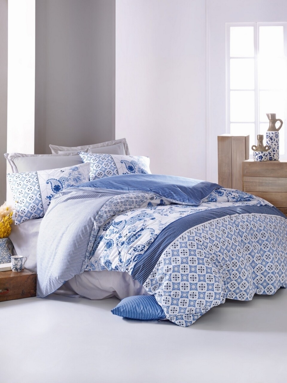 1 cearceaf de pat 240x260 cm, 1 cearceaf pentru pilota 200x220 cm si 2 fete de perna 50x70 cm