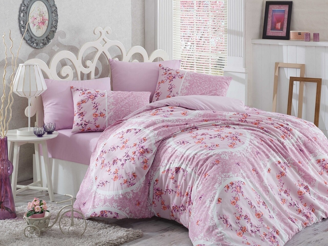 Lenjerie de pat dubla, 4 piese, 100% bumbac ranforce, Hobby, Asia Lilac, roz