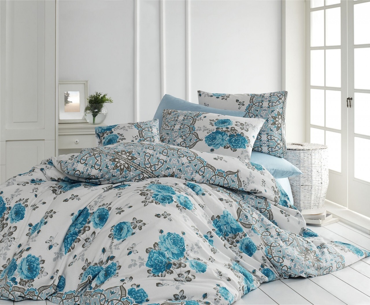 Lenjerie de pat dubla, 4 piese, 100% bumbac ranforce, Nazenin Home, Arnia Blue, alb/albastru