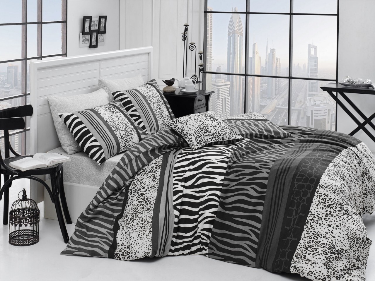 Lenjerie de pat dubla, 4 piese, 100% bumbac ranforce, Nazenin Home, Cheta Brown, alb/gri